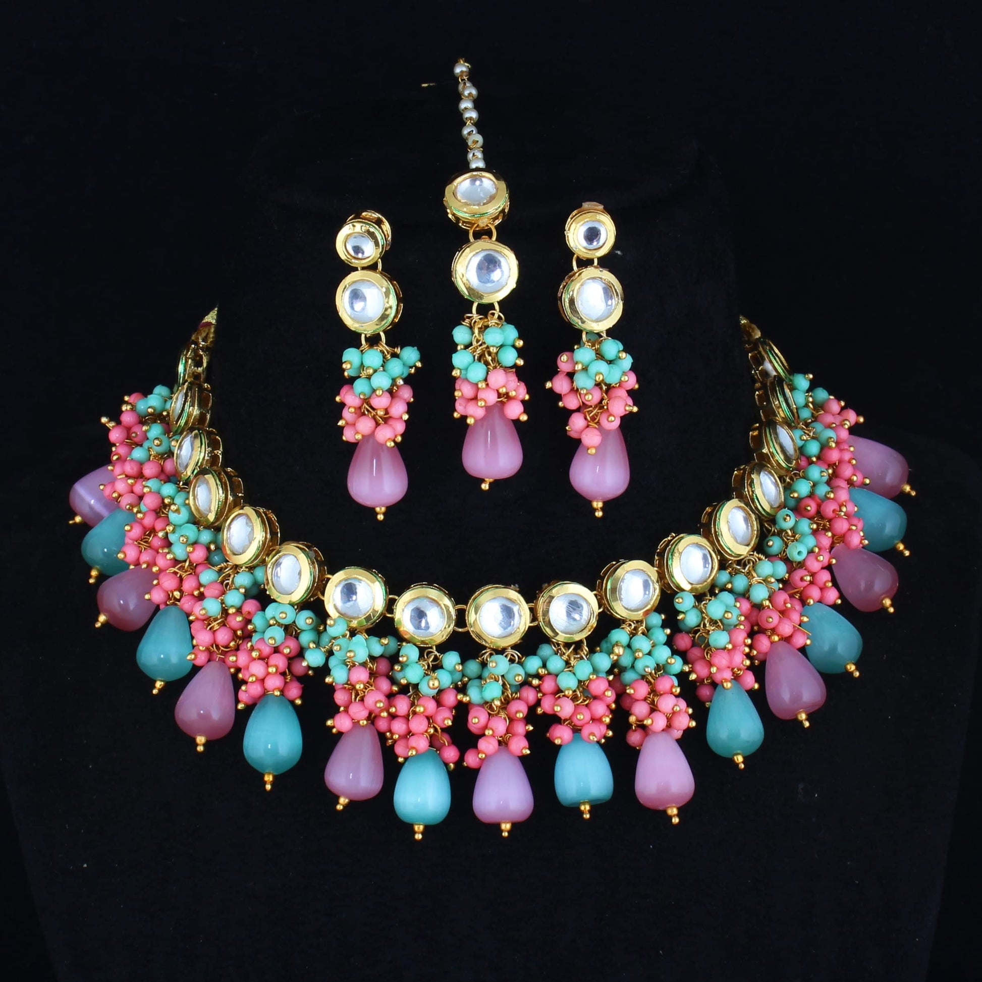 Lucky Jewellery Back Meenakari 18k Gold Plated Multicolor Tika Earring Combo Jewellery Set Uncut Kundan Big Faux Kundan Dibbi Kundan Choker Necklace Set for Girl's & Women