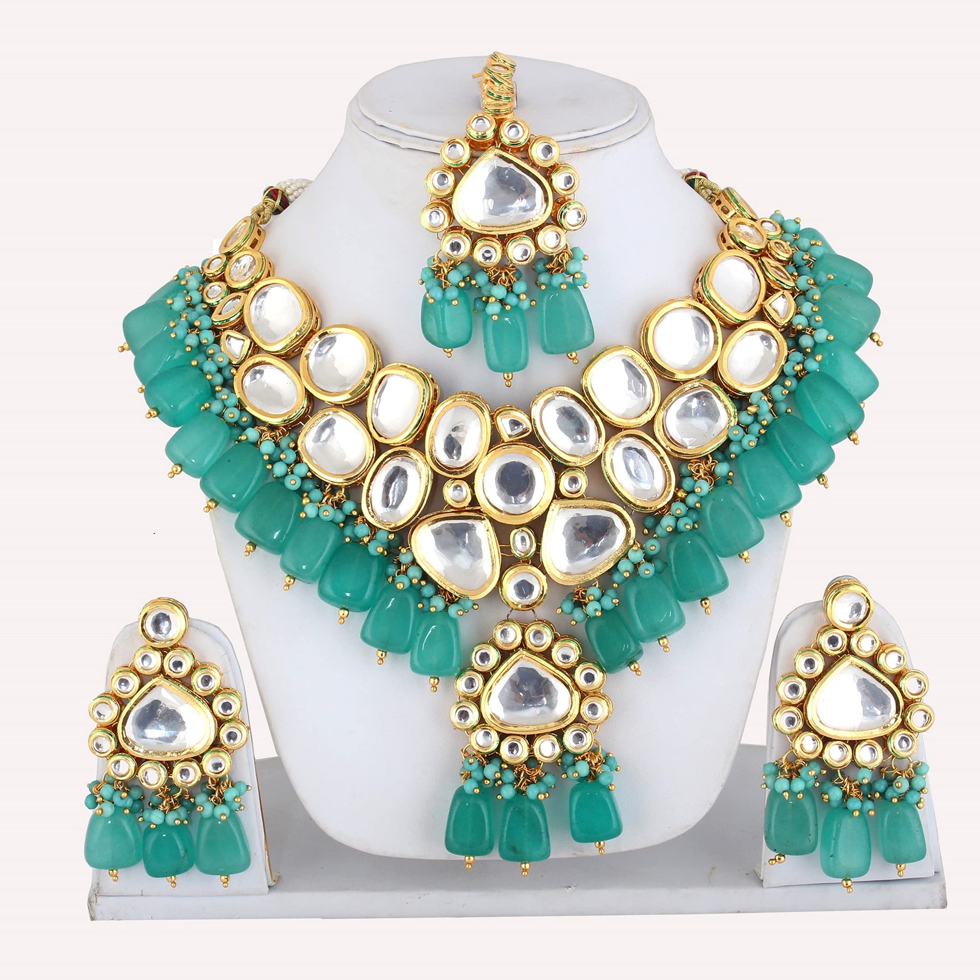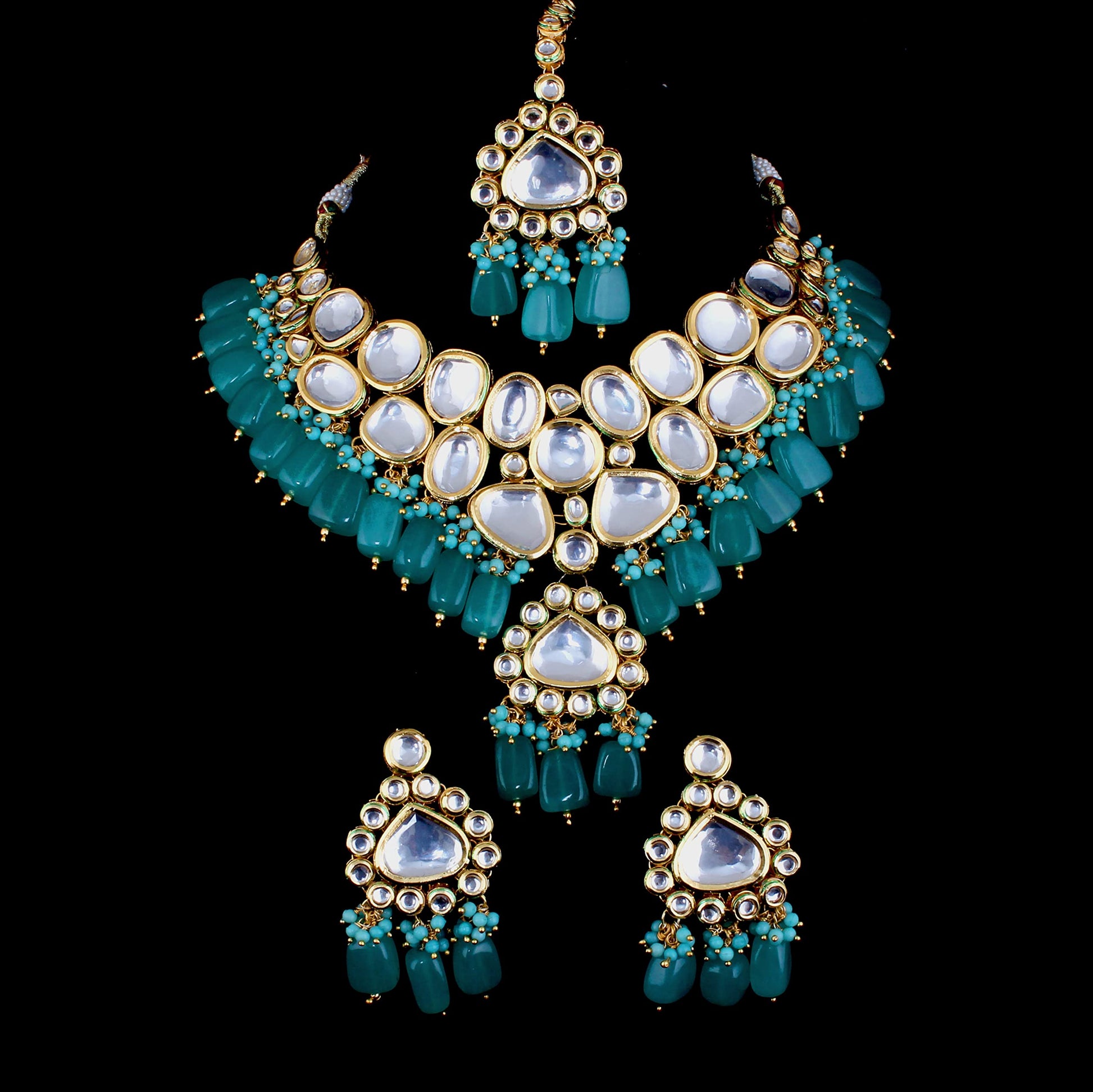 Lucky Jewellery Meenakari 18K Gold Plated Turquoise Blue Pentagon Shape Uncut Kundan Combo Necklace Set For Women