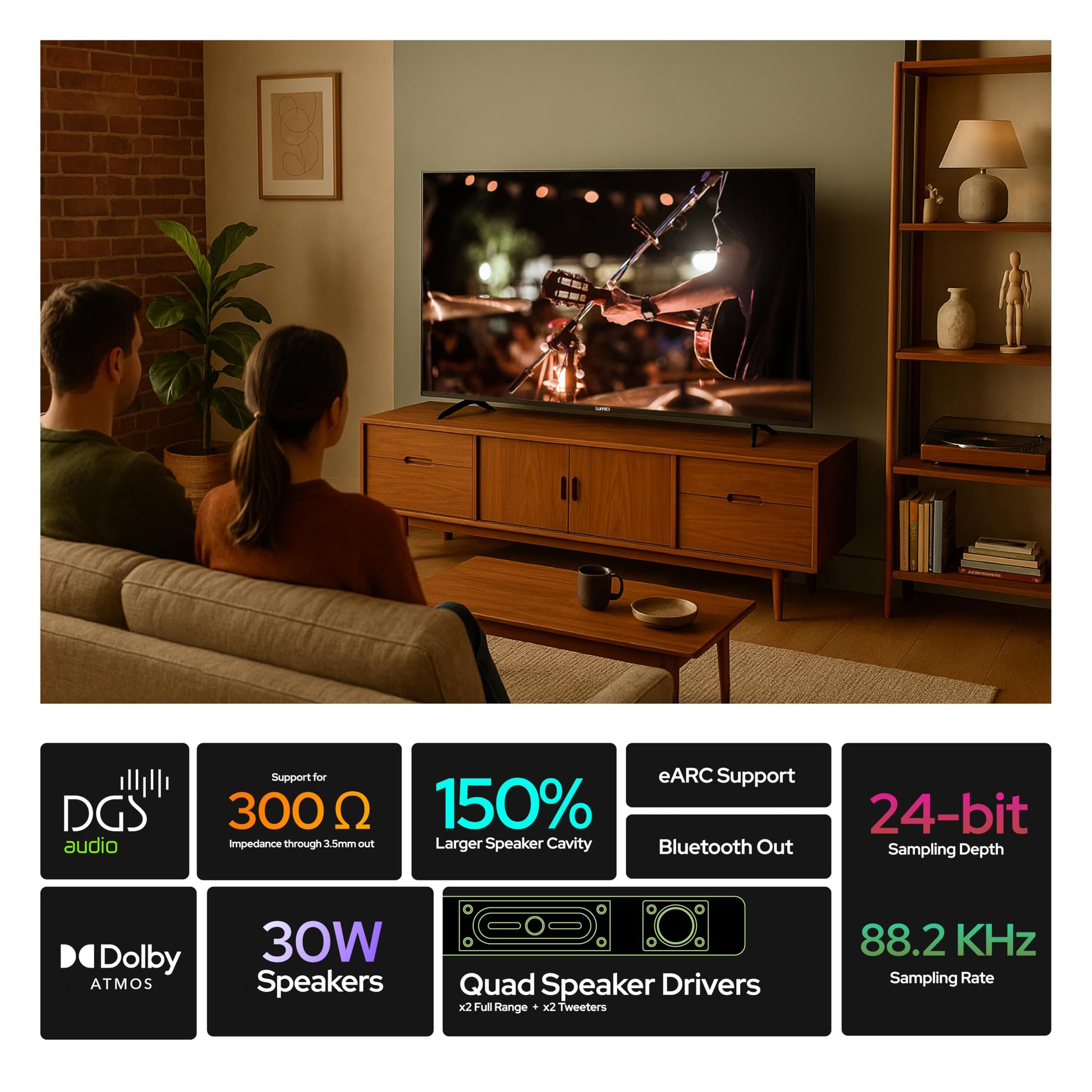 - Sound: DGS Sound | 24 Watts Output | Quad Driver Speakers (2 Tweeter + 2 Full Range) | Dolby Audio | Dolby Atmos | Large Speaker Cavity for Crystal Clear Sound