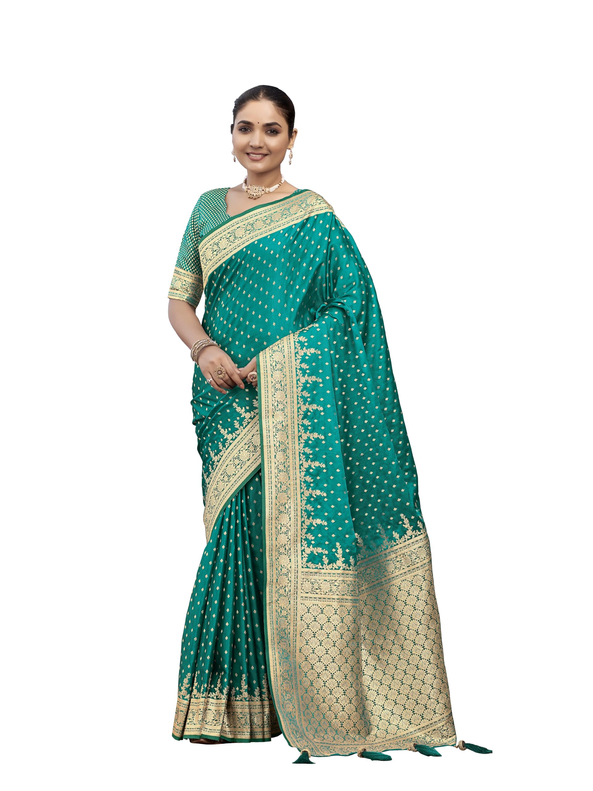 MANOHARI Women's Most Trendy Banarasi Satin Silk Woven Green Saree With Heavy Jacquard Work Saree With Blouse Piece_MN1995
