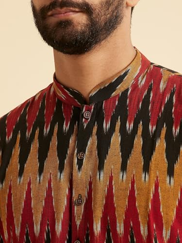 Manyavar Men's Cotton Blend Ikat Prints Full Sleeves Casual Mid-Length Kurta (Mustard,XL)