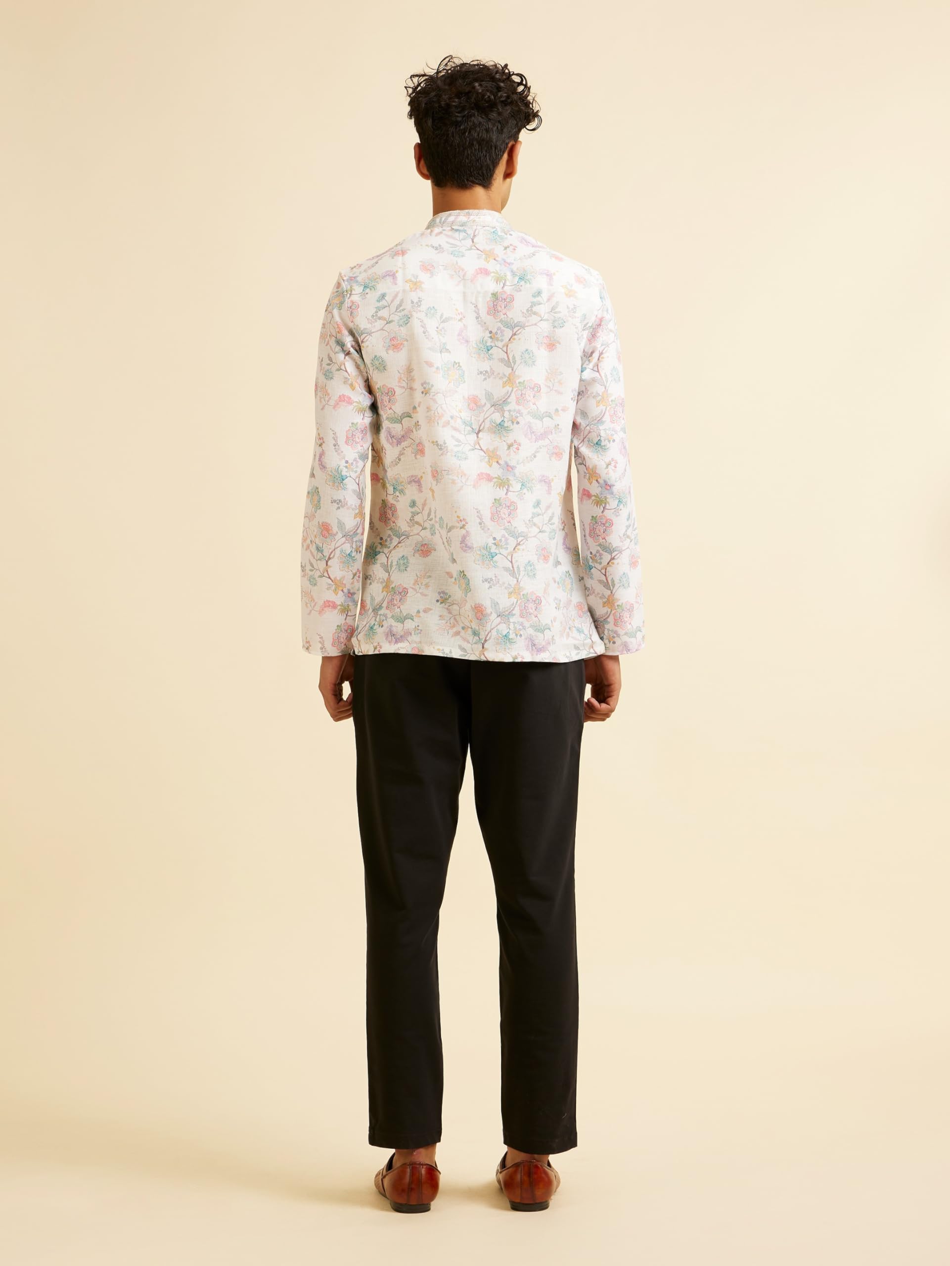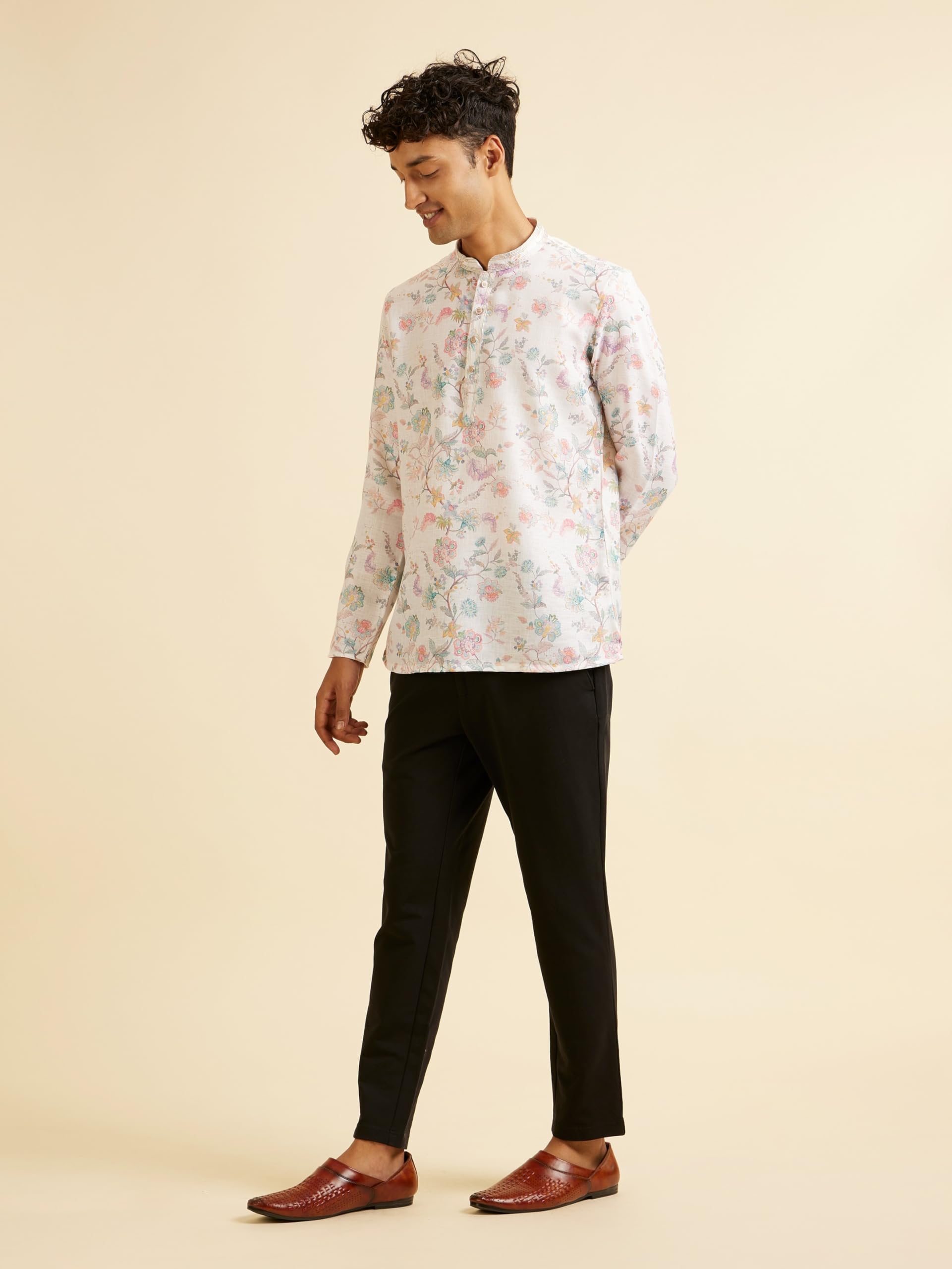 - Design:-Elevate your casual style with our Warm White Floral Print Short Kurta for men. This contemporary piece features a subtle yet eye-catching floral pattern on a soothing warm white backdrop. The short length adds a modern touch to the traditional kurta silhouette, making it perfect for casual outings, brunches, or relaxed festive gatherings. Pair with tailored navy blue chinos and tan leather loafers for a smart-casual look.