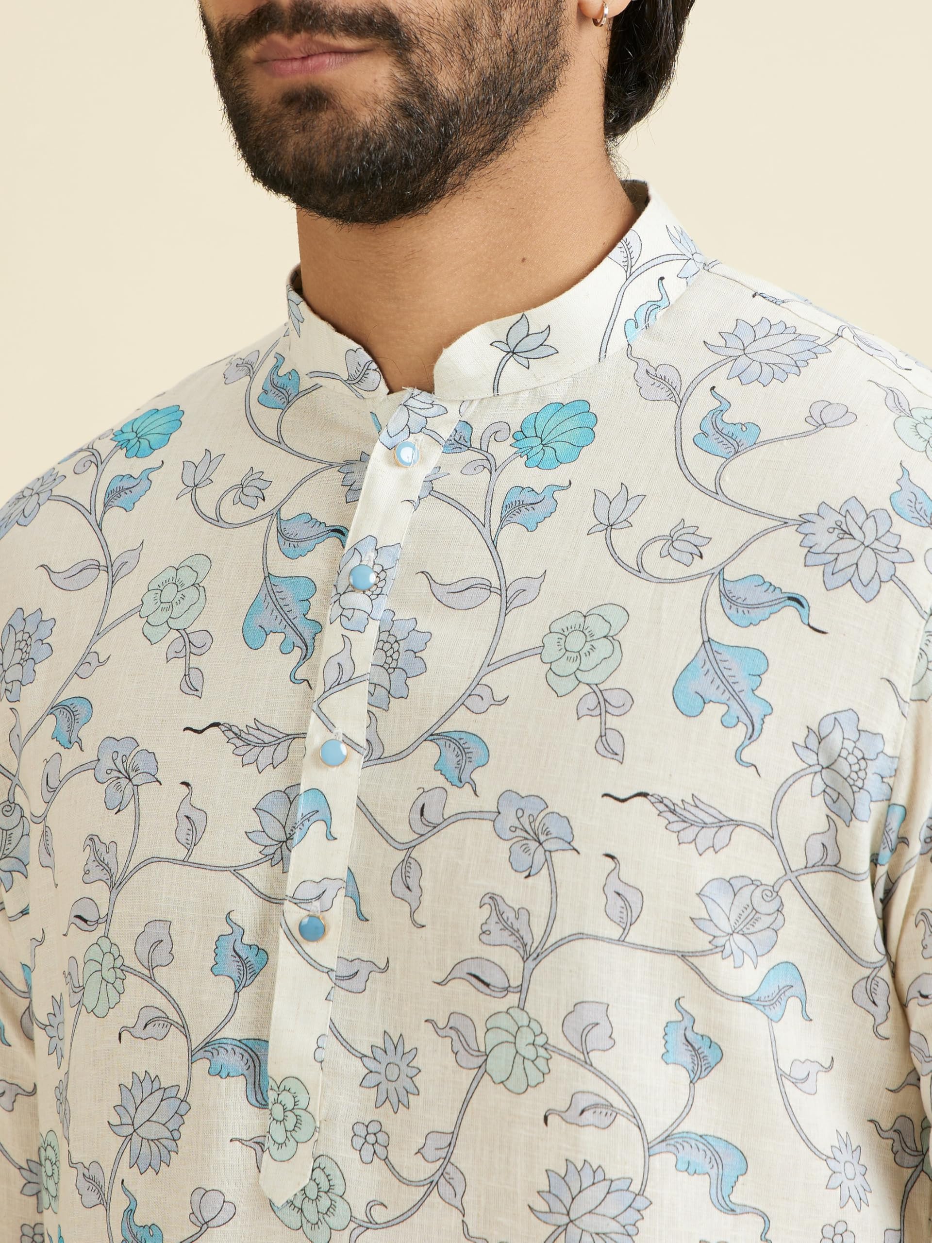Manyavar Men's Linen Blend Floral Print Kurta (Cream,L)