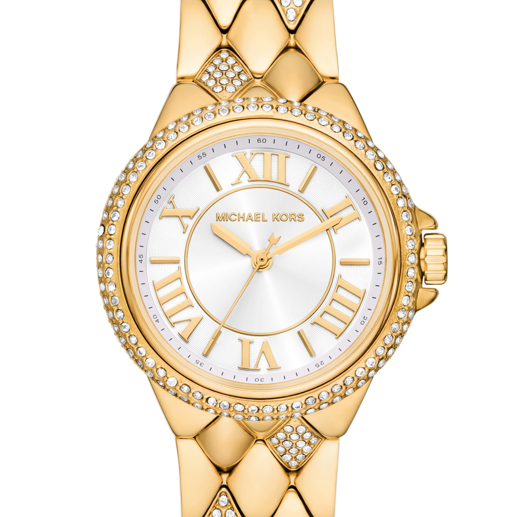 Details: Michael Kors' 33mm Camille watch features a white sunray dial, three-hand movement and gold-tone quilted waterfall pavé stainless steel bracelet.