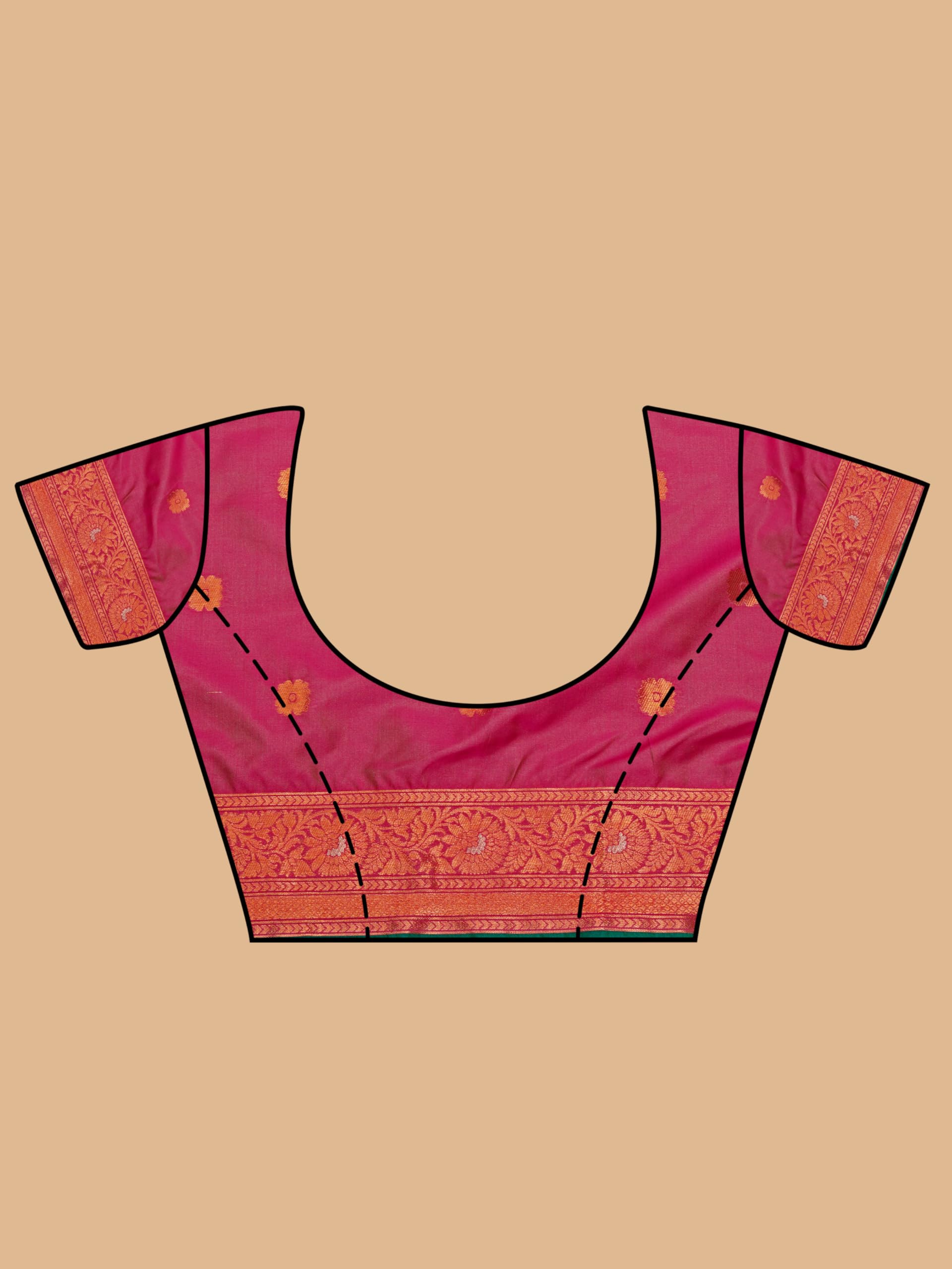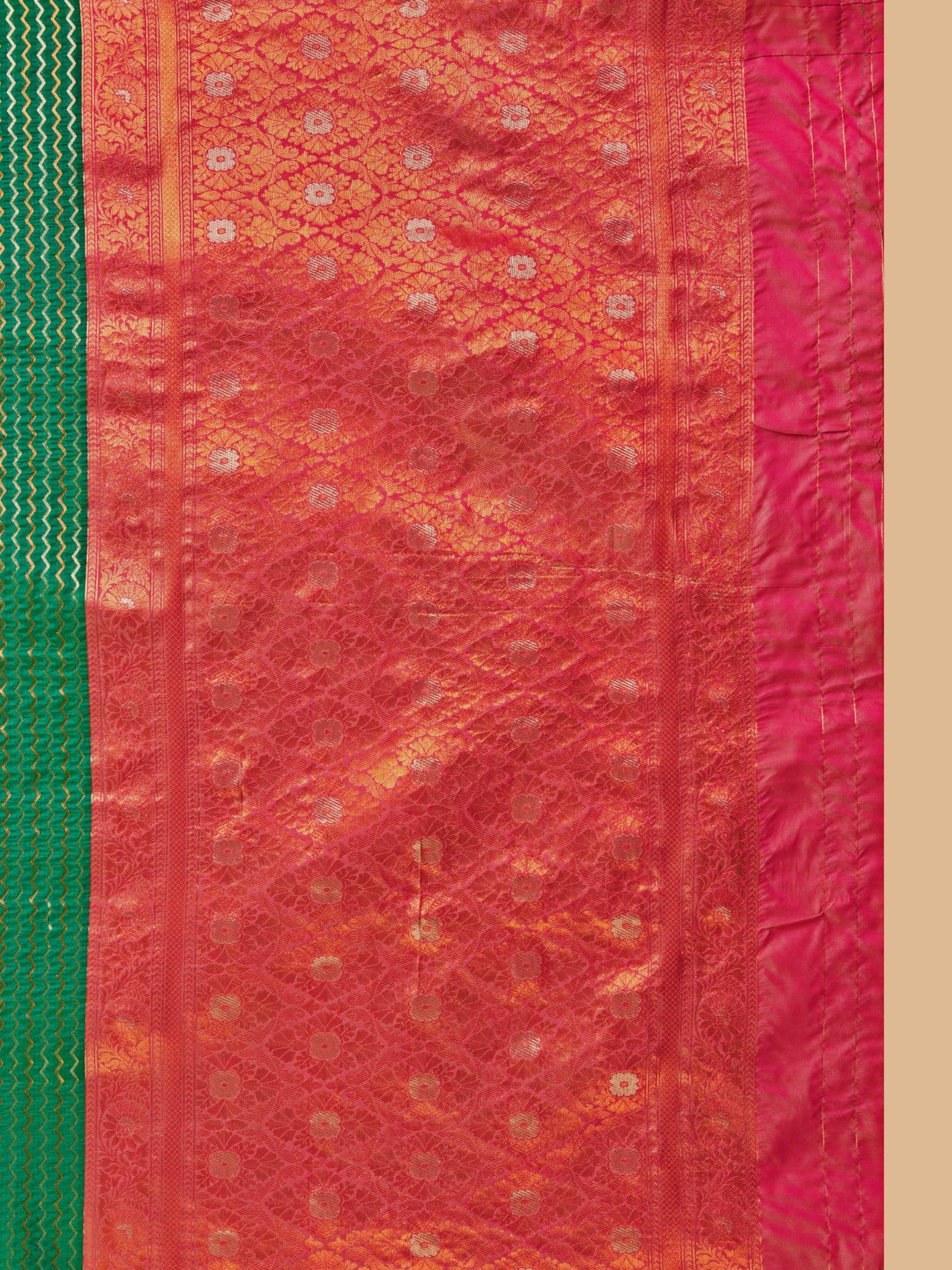 Green color Traditional Saree, With Woven Mixture Of Zari And Woven Thread design All over , Has Zari woven border and pallu , Comes With Pink Color Contrast Unstiched Blouse (Included In sarees Length 5.40 Mtr+.80 Cm)