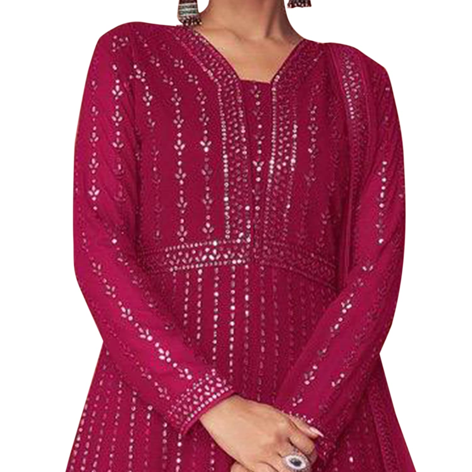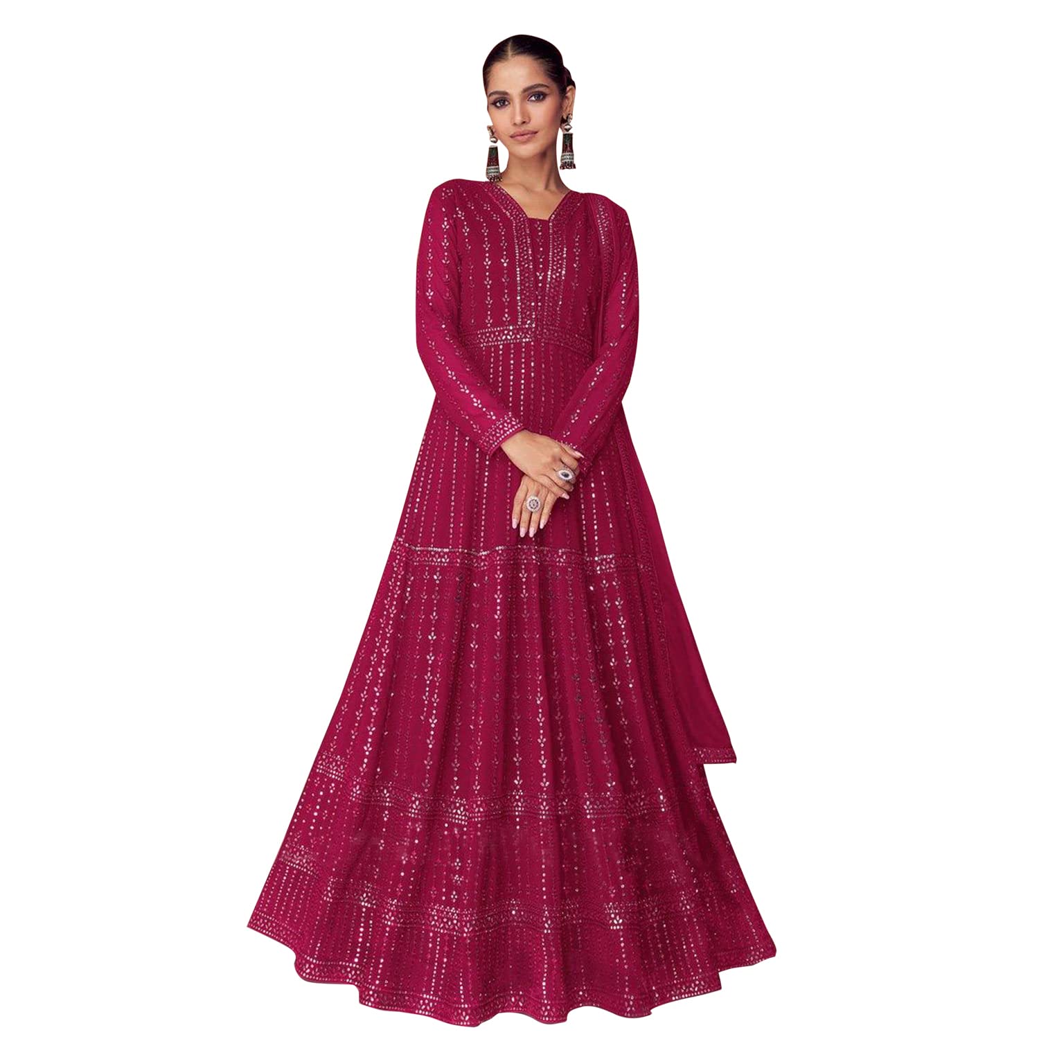 Miss Ethnik Women's Faux Georgette Full Sleeve Stitched Embroidered Floor Length Pink Anarkali Gown with Dupatta (ME-1106-Pink-L)