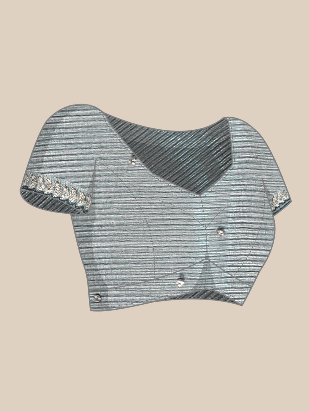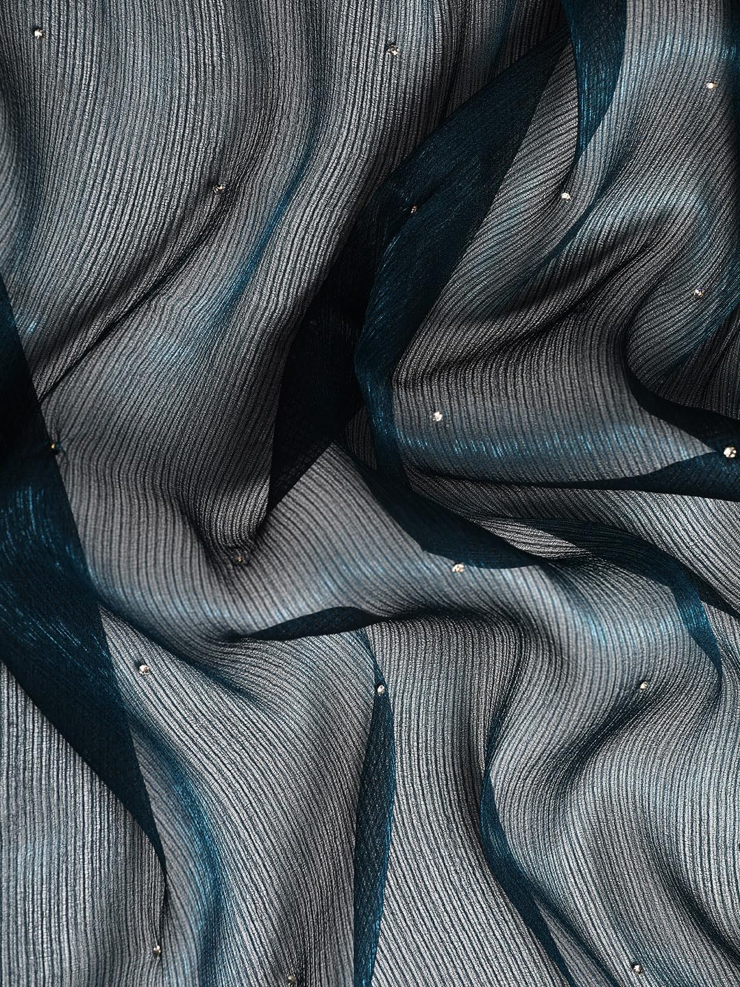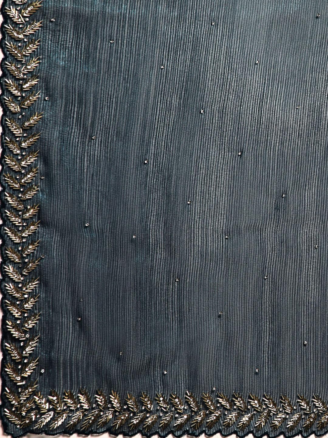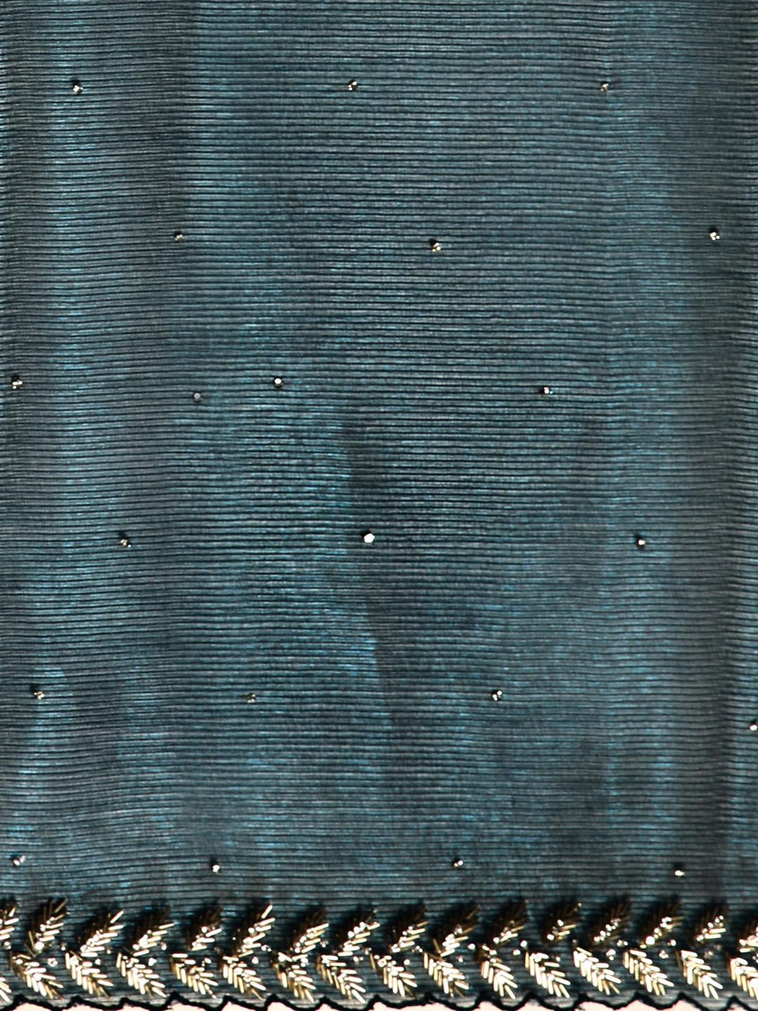 - Design: Featuring leaf motifs in cutdana work with rhinestone highlights along the borders, this peacock blue saree dazzles with rhinestone work speckled across its fabric. Accessorize with diamond jewellery to mirror the saree's shimmering details. Ideal for formal gatherings or celebratory events, this saree marries the beauty of traditional motifs with the sparkle of modern embellishments.