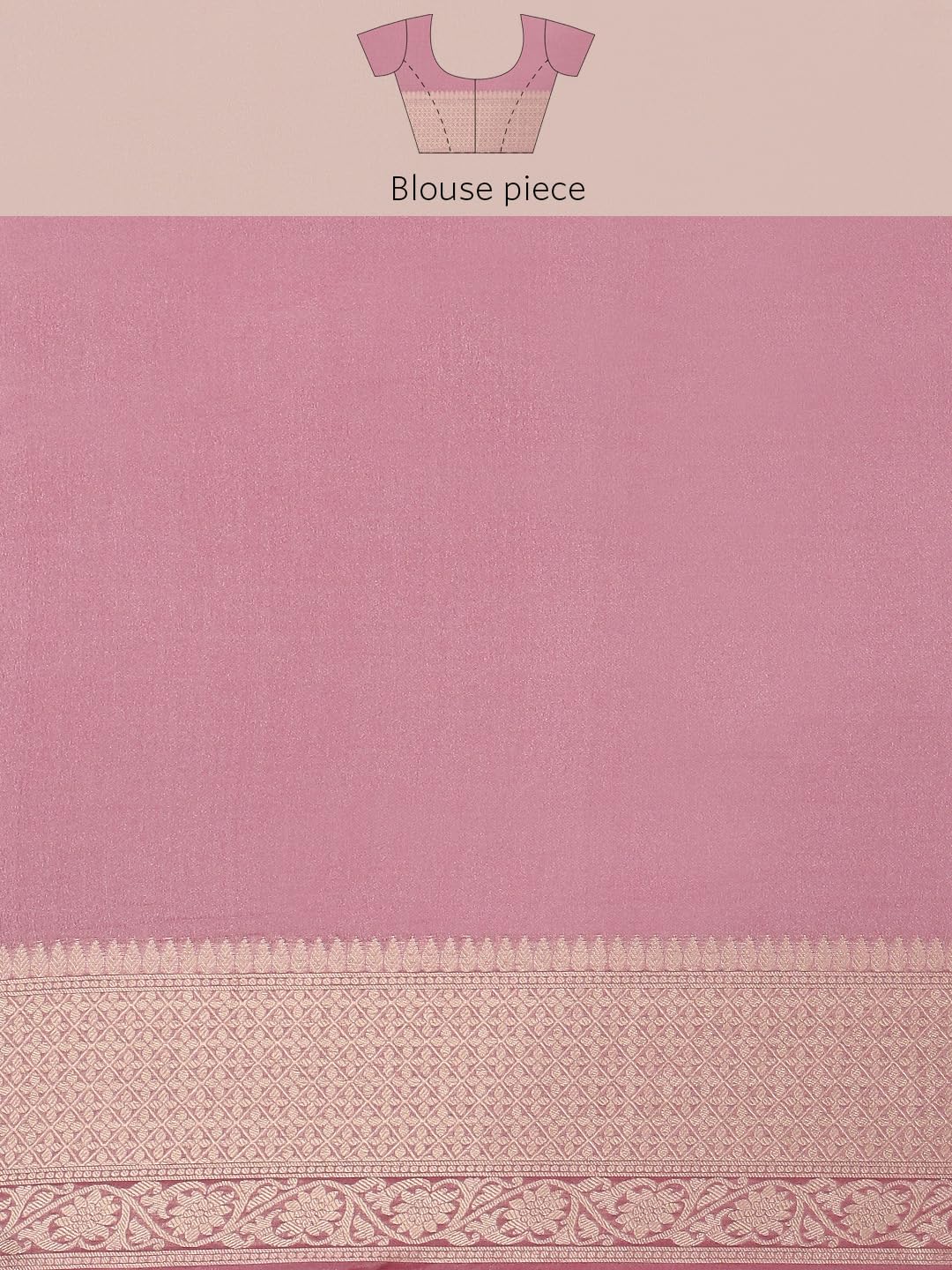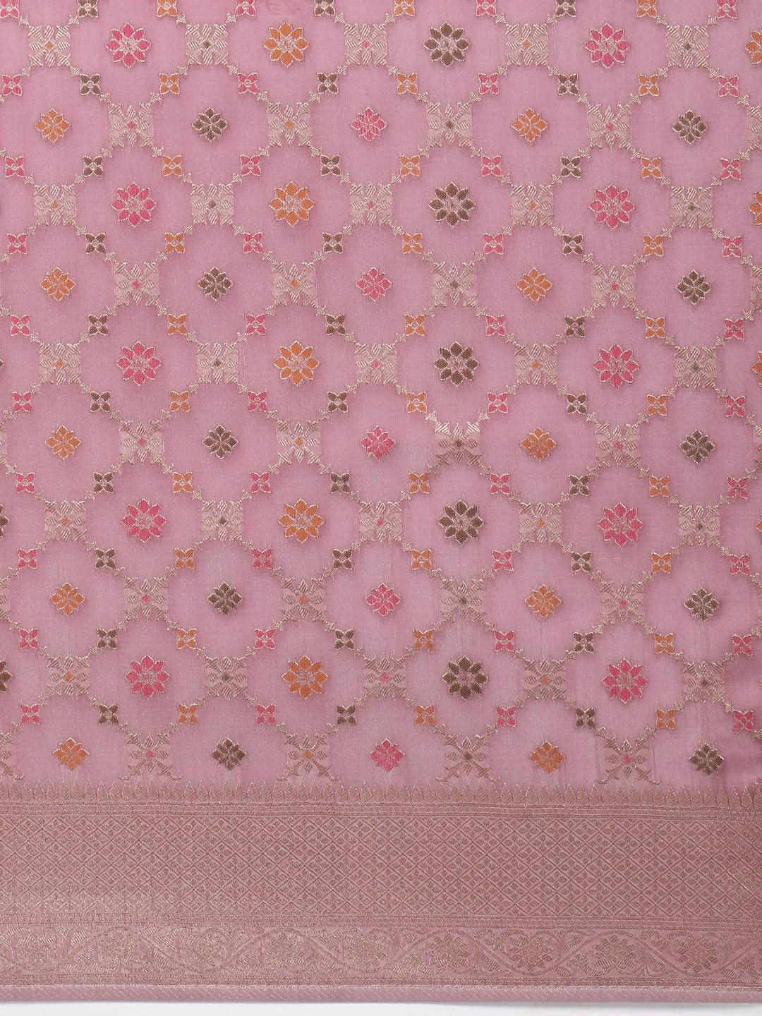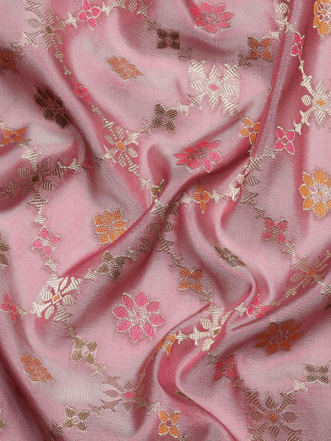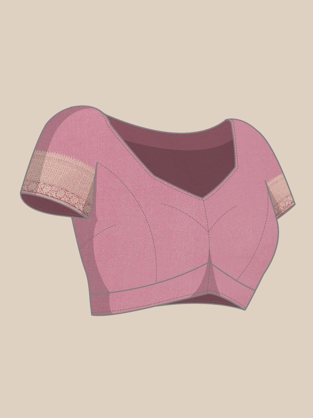 - Design: This purple saree exudes elegance with its all-over floral jaal pattern, intricately designed with vibrant floral motifs. The border is beautifully accentuated with a contrasting bel buti pattern, adding a touch of tradition and finesse. To style this saree, pair it with a high-neck, sleeveless blouse and statement silver jewelry to highlight its rich colors and detailed craftsmanship, perfect for festive occasions or formal gatherings.