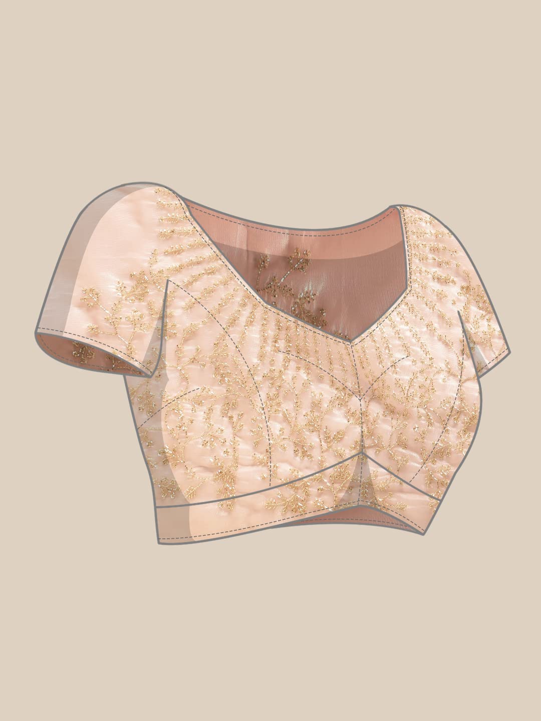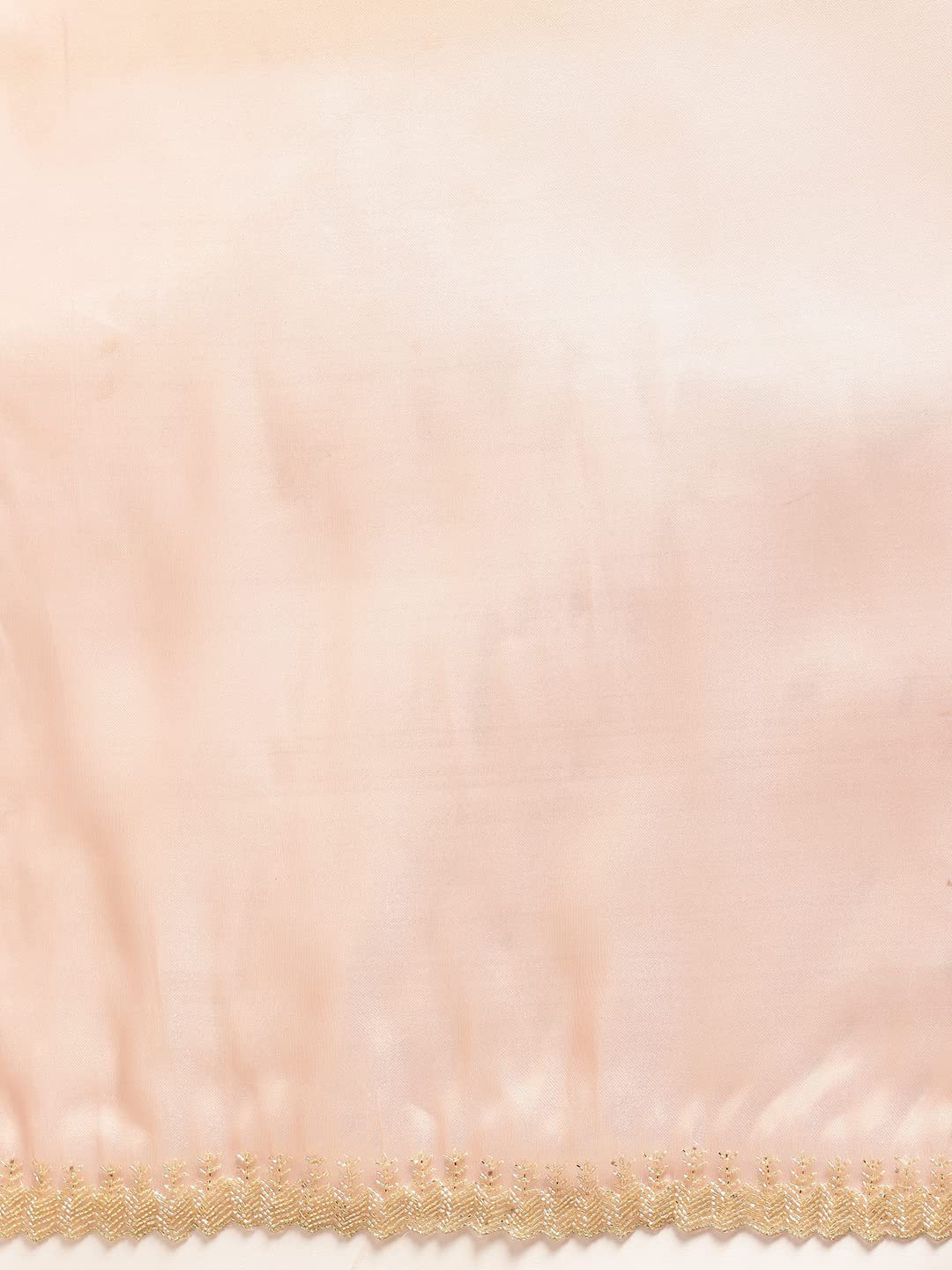 - Design: Adorned with golden cutdana work in chevron and fern patterns along the borders, this coral pink saree is elegantly simple yet striking. The precise cutdana work adds texture and a touch of glamour to the solid coloured fabric. Enhance this saree with gold jewellery and embellished sandals for a cohesive look. Ideal for formal events and weddings, this saree balances traditional elegance with modern sophistication.