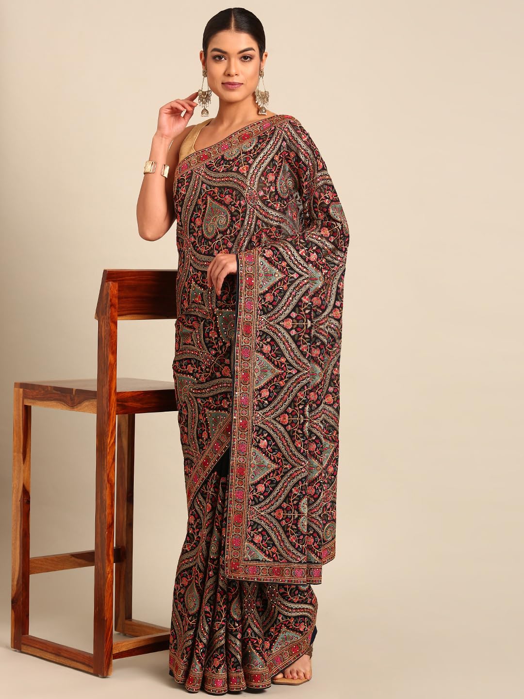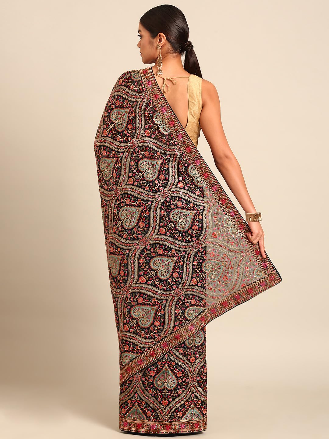 MOHEY Women's Blue Georgette Embroidery|Stone Work Saree with Blouse Piece