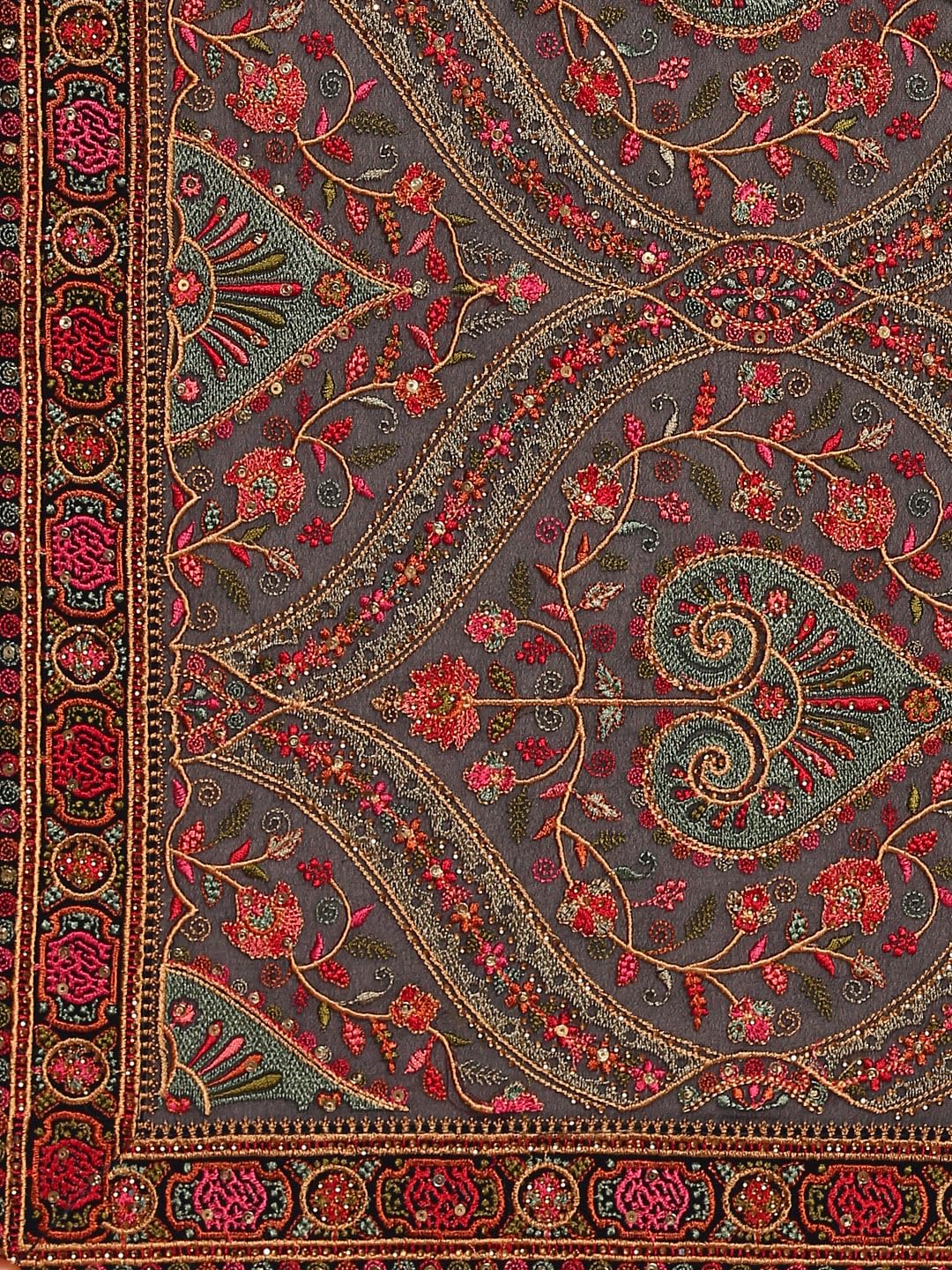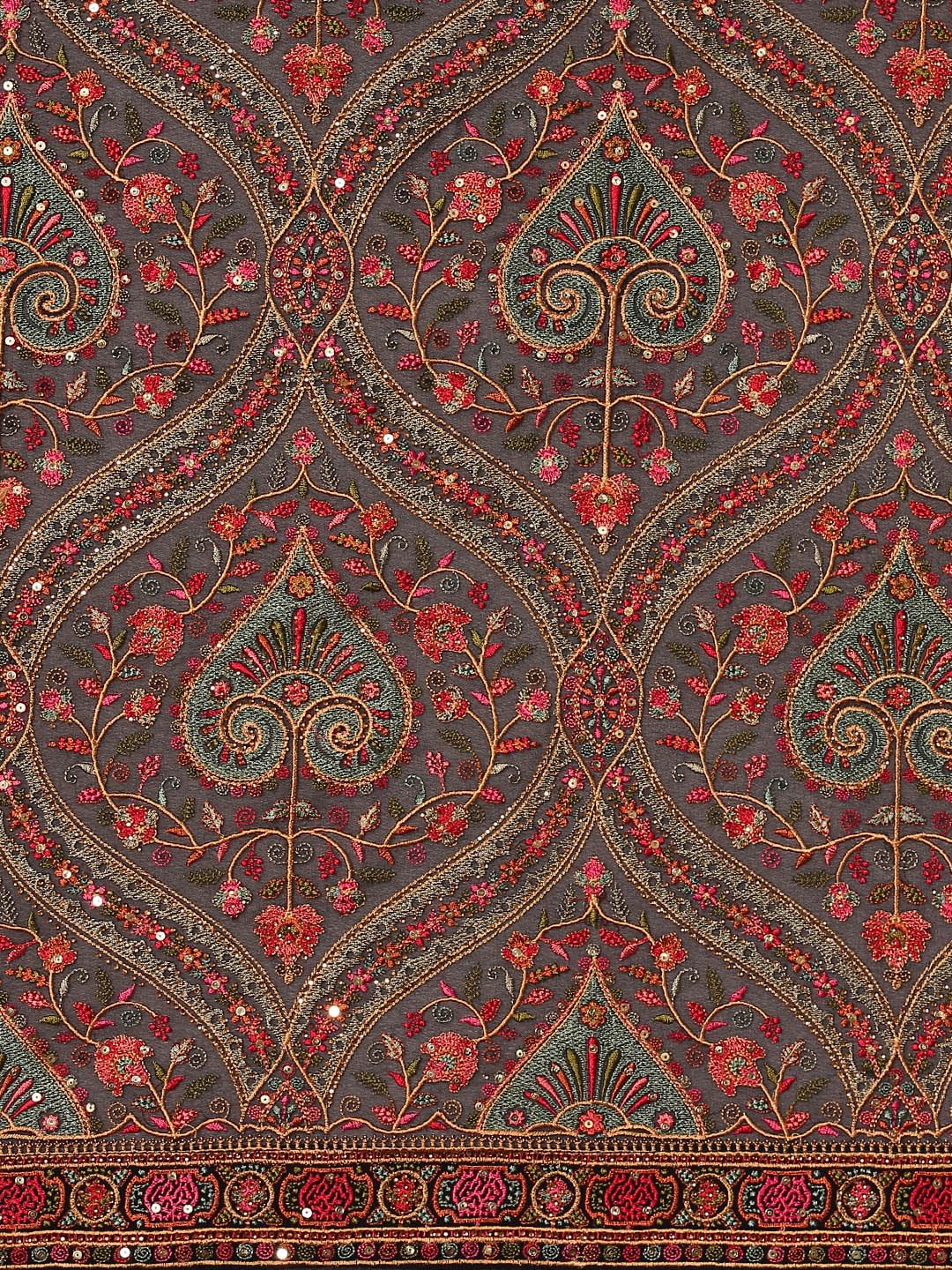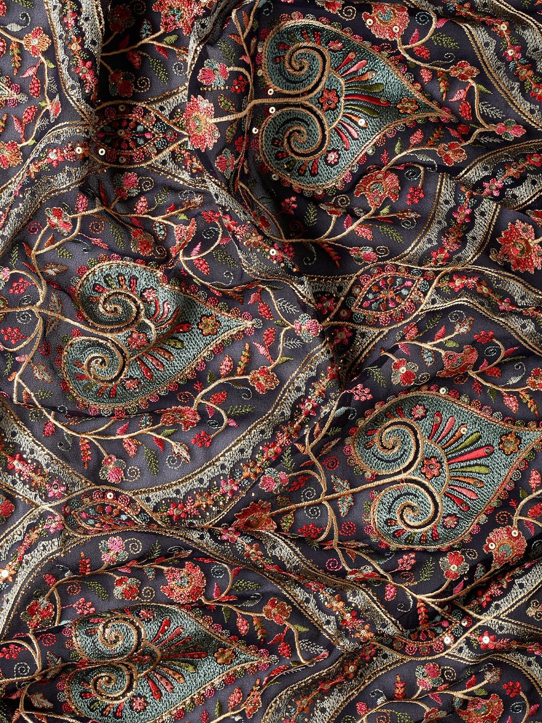 - Design: This teal blue saree showcases the unique paan leaf motif, intricately embroidered within an ogee pattern and adorned with sequin and rhinestone work. The saree is further decorated with bel buti and jaal pattern floral patterns all over, creating a rich tapestry of multiple patterns in multi coloured hues. This saree is a stunning choice for special occasions, radiating elegance and vibrancy. Style it with a choker, drop earrings and heels.