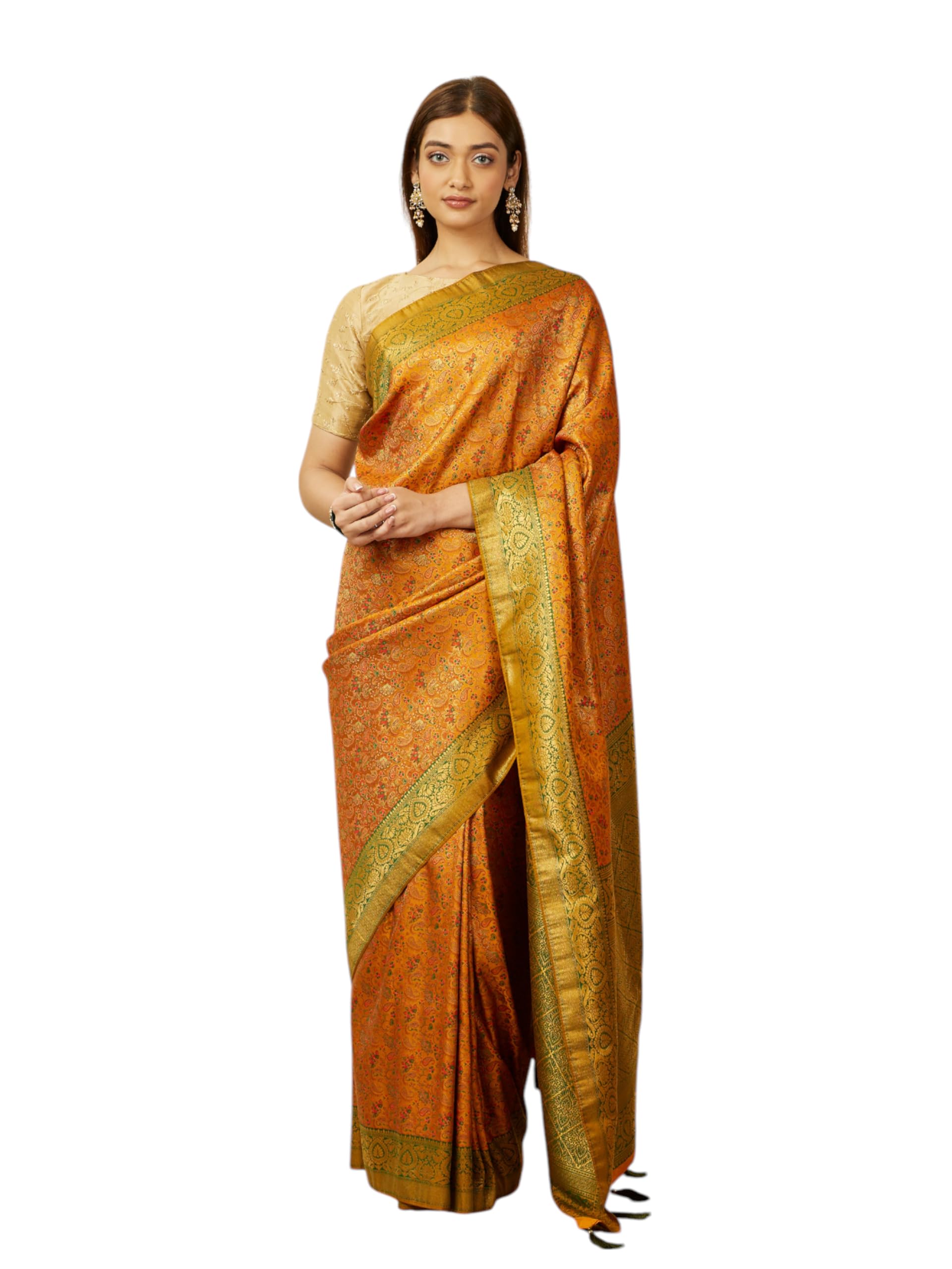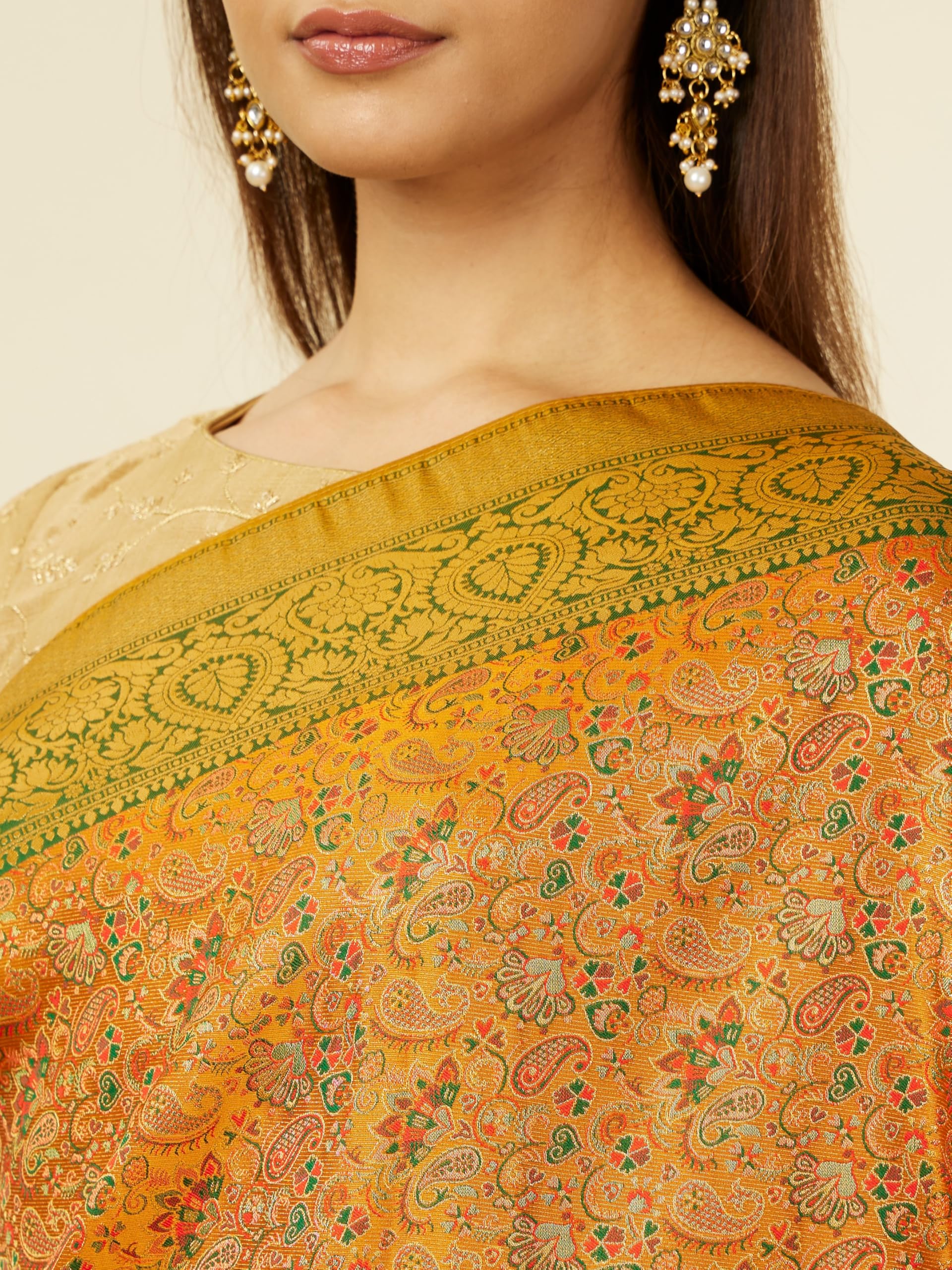 - Design: This Mustard Yellow saree features a bel buti pattern all over the body. The border is enhanced with paisley like floral design and a trimmed latkan. Accessorize with sleek gold jewellery for a balanced look. Perfect for cultural events or celebrations, this saree showcases vibrant village life through its intricate embroidery and embellishments.