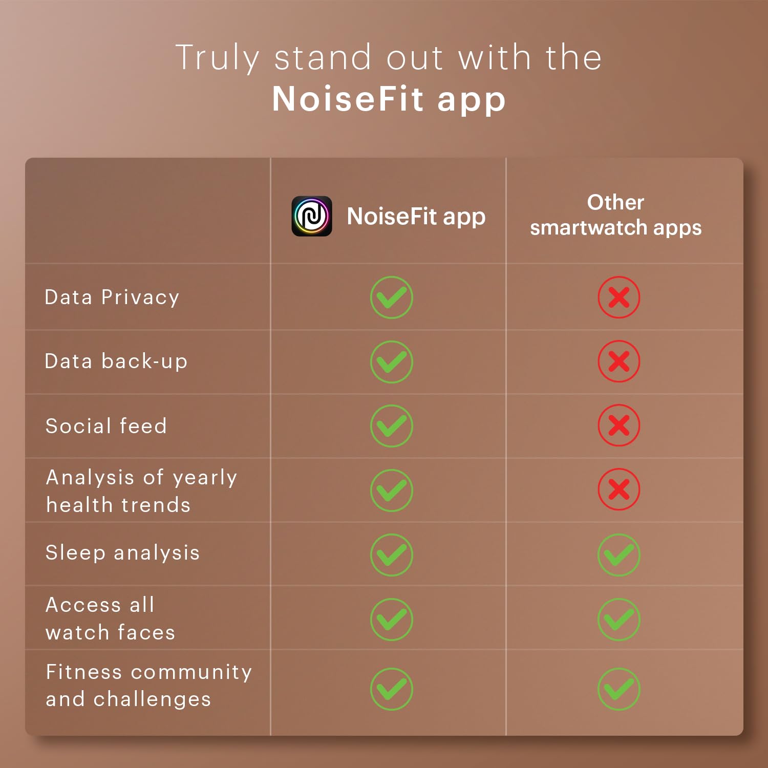 • NoiseFit app: Connect with the NoiseFit app where your health data and privacy are always protected. Unlock your peak potential by participating in challenges, track your progress, and keep pushing your limits with a community of fitness enthusiasts.