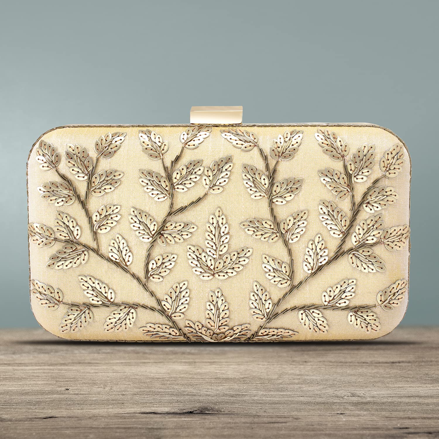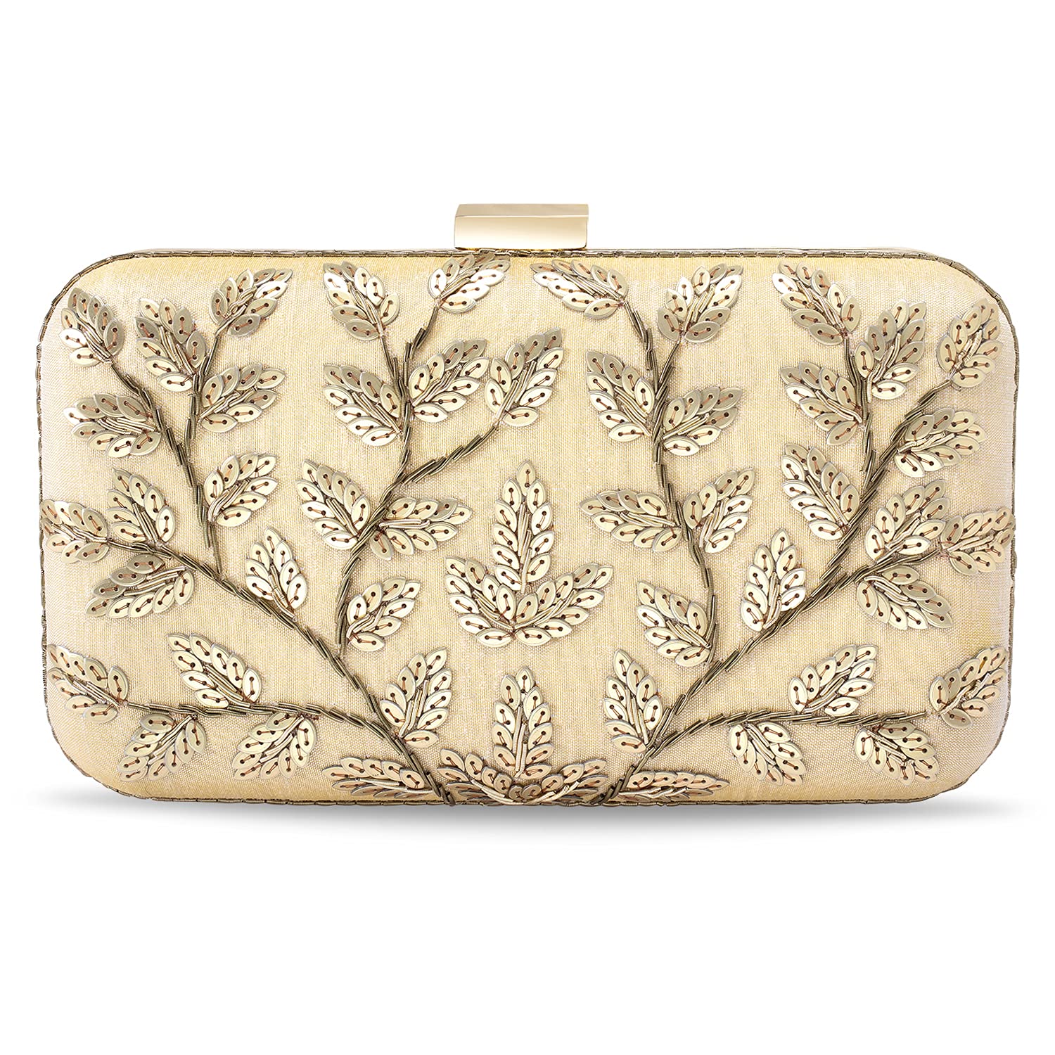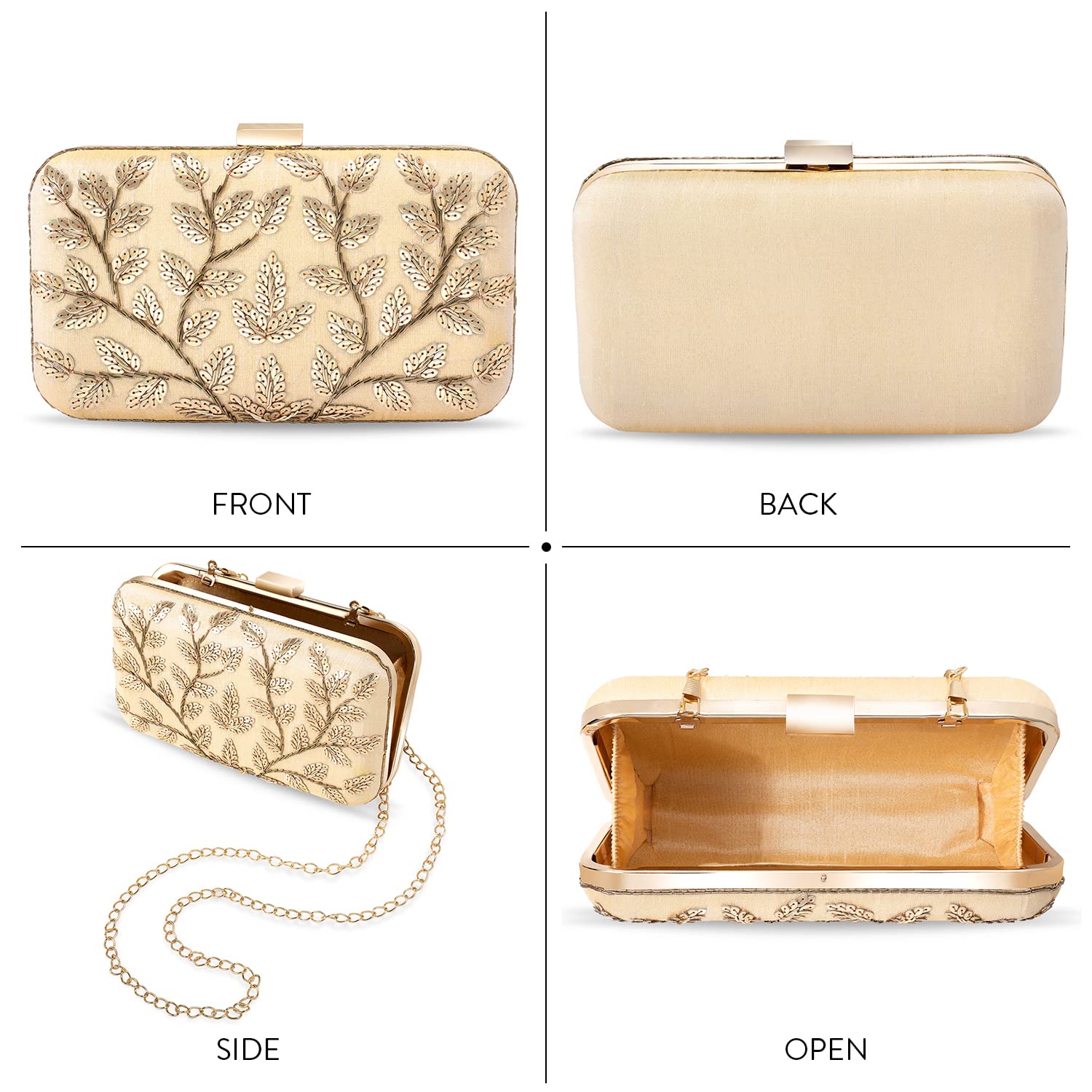 - KEY FEATURES : Wedding Clutch Dimension:- L - 7 x W - 3.5 x H - 1.2 Inches, Weight- 0.31 KG | Type:- Box | Color:- Gold | Size:- Regular | Material:- Fabric
