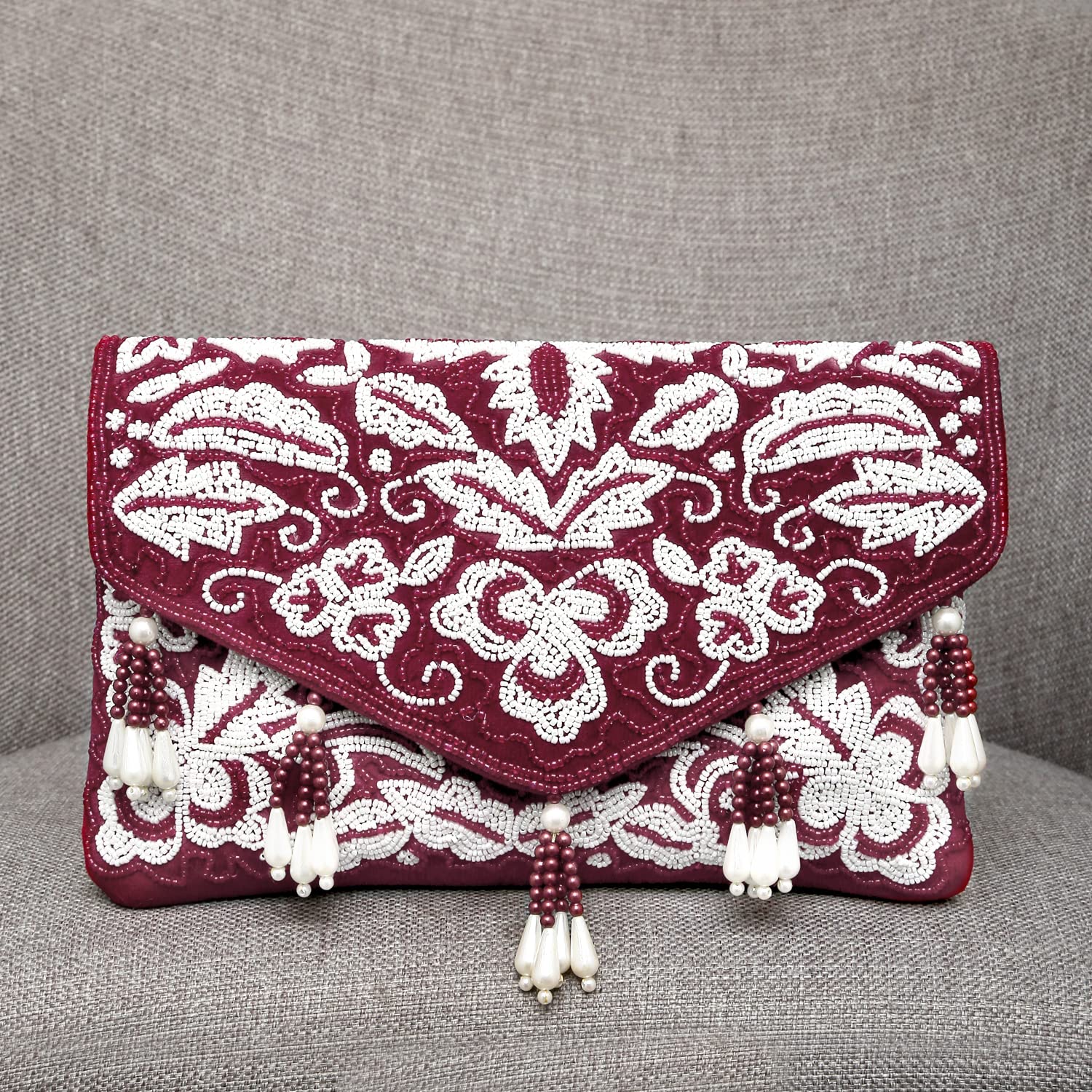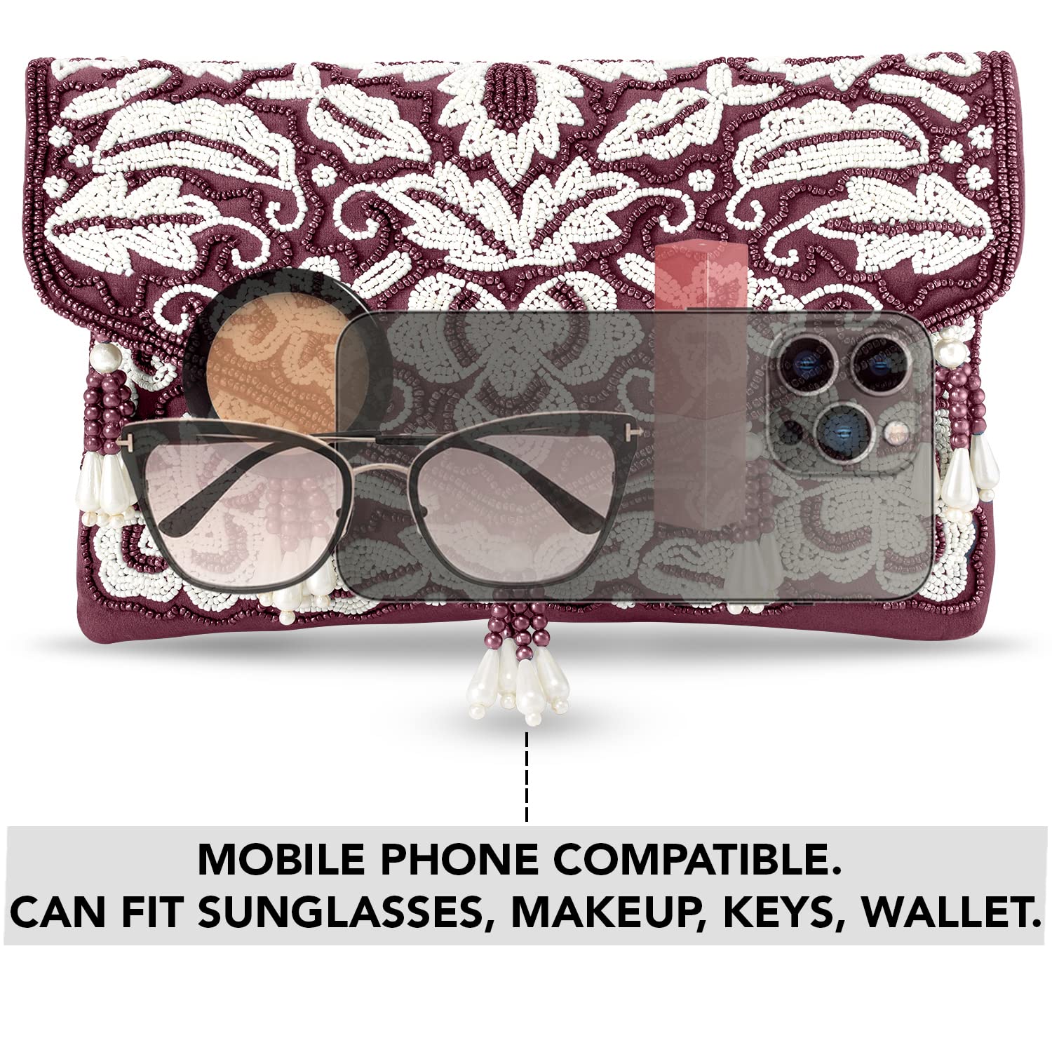 - DESIGN: Embellished with Indian hand work, the soft fabric interior of the evening bag has enough room to keep your credit card, cash, and other small essentials like mobile phones, lipstick, highlighter, keys.