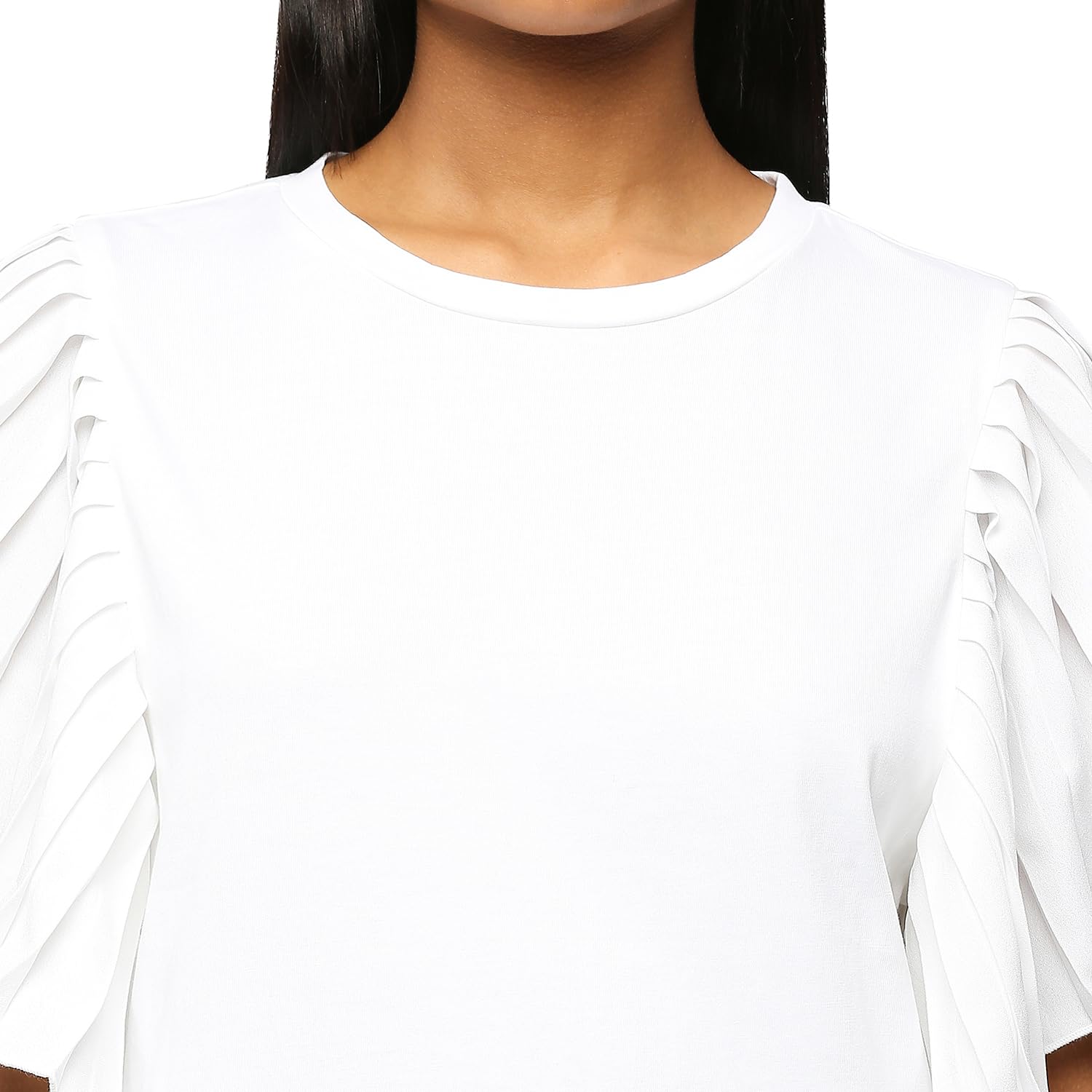 Elevate your style with this women's white T-shirt. Thanks to its regular fit and crafted from high-quality cotton, it offers breathable comfort. The tee showcases fabric mix detailing at the sleeves and a round neckline, making it a trendy and fashionable choice. With short sleeves, it's perfect for any day, ensuring you stay both stylish and comfortable throughout casual outings, social gatherings, and leisurely activities. Style it with your favourite jeans, flats, and hoop earrings to complete your casual look.