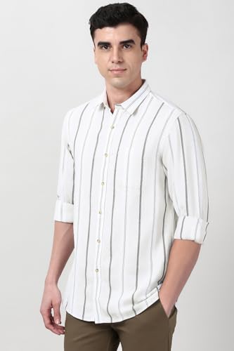 Peter England Cotton Linen Blend Shirt for Men – Full Sleeves, Subtle Stripes Beige