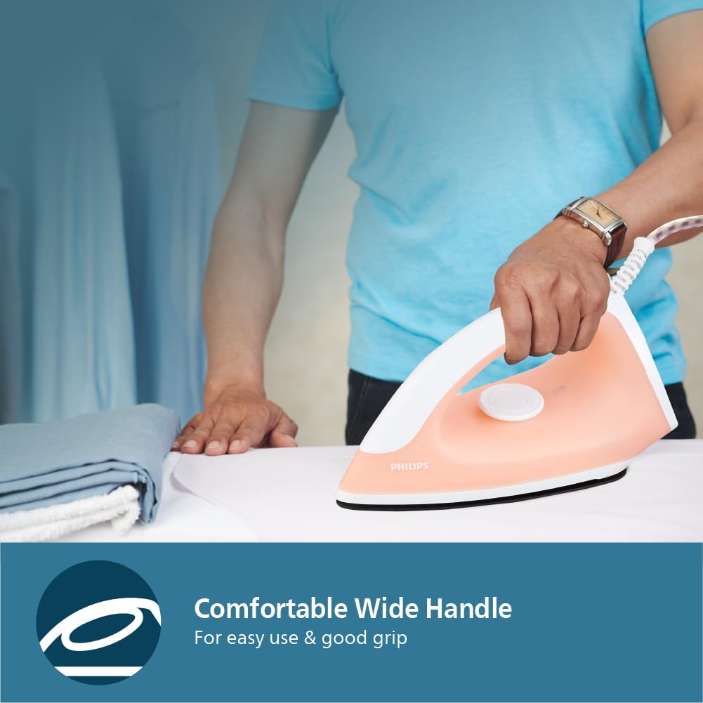 Philips GC097/50 750-Watt Dry Iron (World no. 1 Ironing Brand), Light & Easy to Use, Powerful 750 Watt Heat up with a comforable wide grip, Black Non Stick Soleplate (Peach)