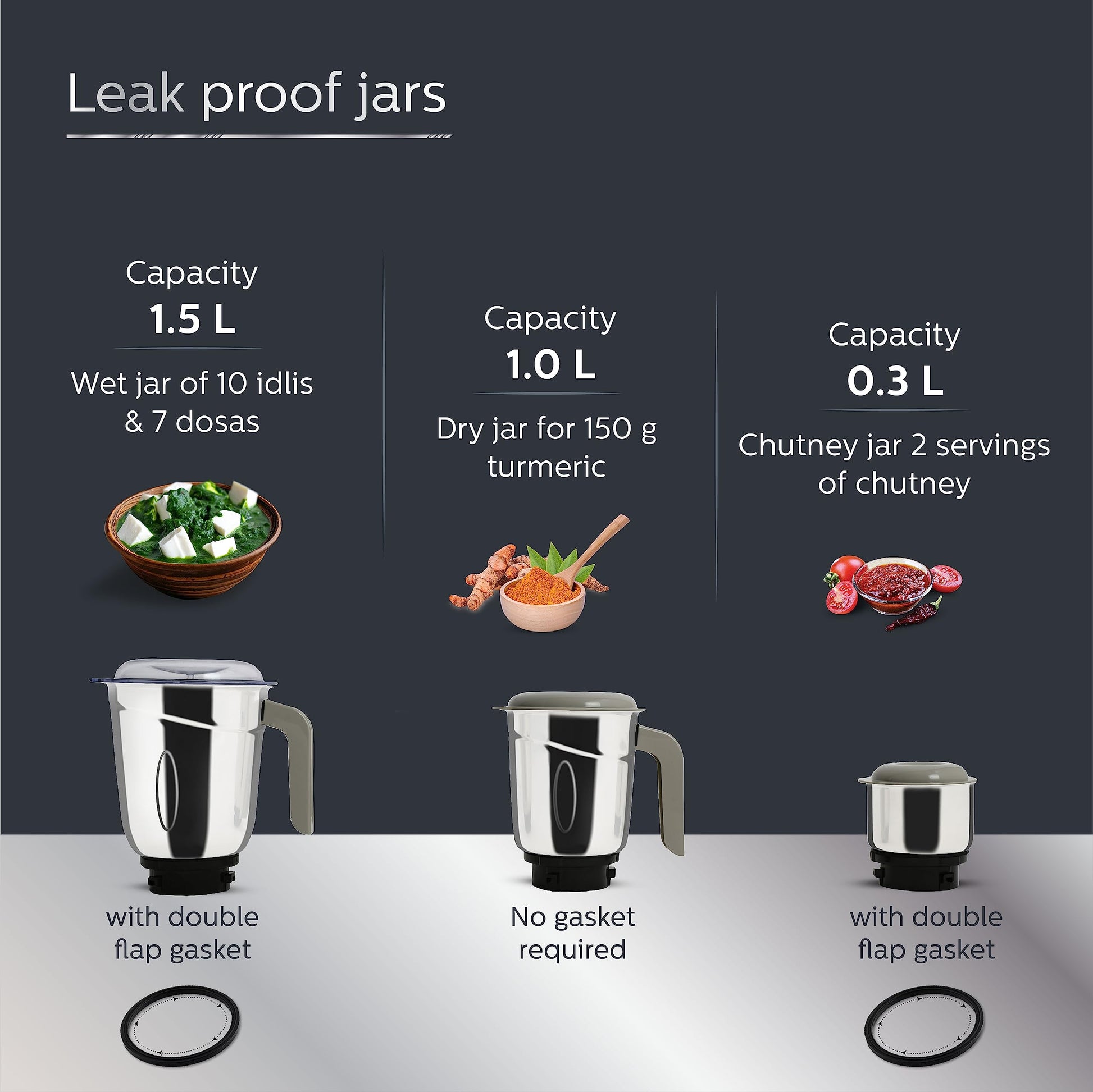 - No of Jars: 3; Jar Size: Wet Jar (1.5 Litres), Multipurpose Jar (1 Litre), Chutney Jar (0.3 Litres); Jar Material: Stainless Steel; Body Material: ABS; Blade Material: Stainless Steel; Speed Control: 3 Speed Control + Pulse