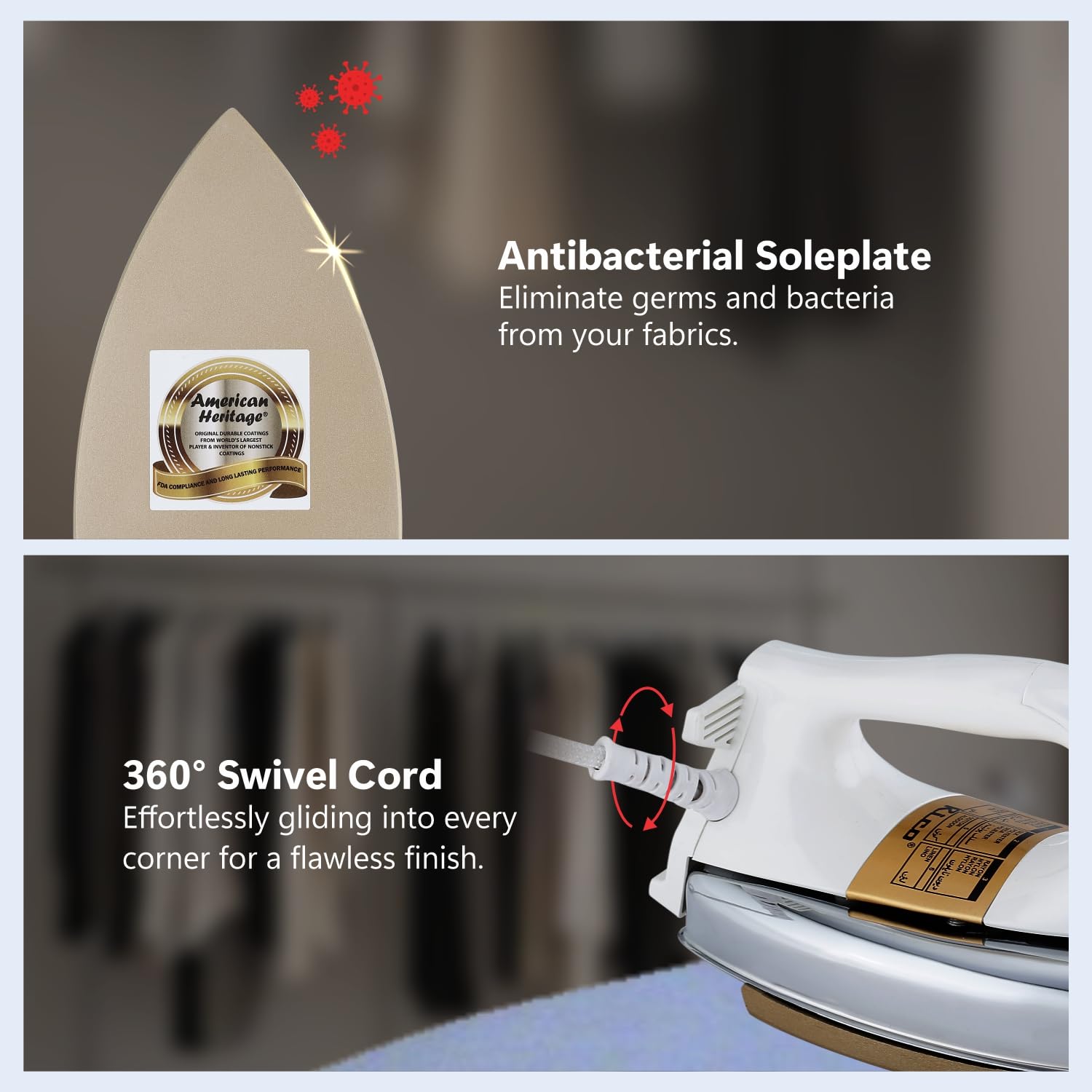• 3 Layer Golden Non-stick Coating - This iron press comes with premium golden American heritage sole-plate coating which is 3 times longer & stronger than nonstick coating that is suitable for all fabric types.