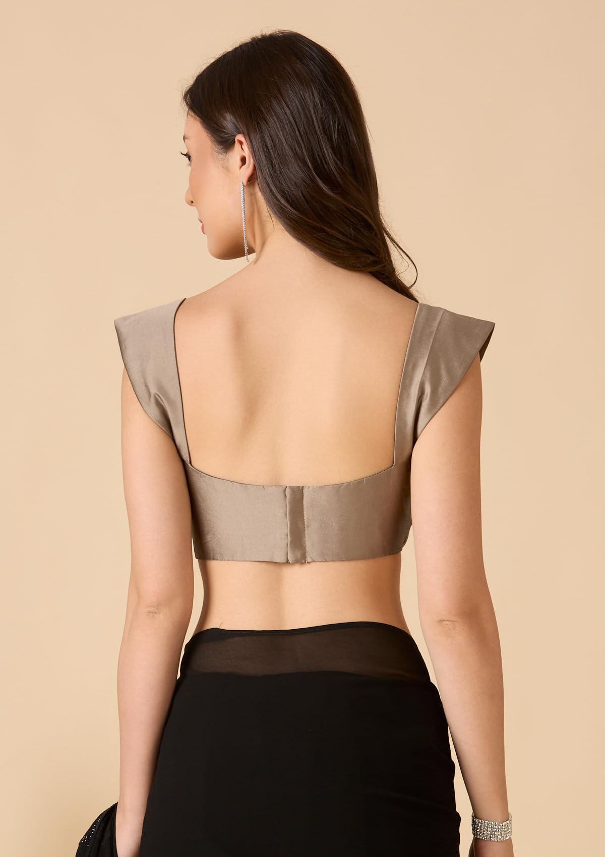• Copper taffeta silk blouse with sweetheart neck, sleeveless, padded & back hook—versatile & elegant.