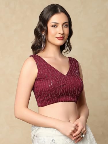 - Wine Georgette sleeveless readymade saree blouse, has a V-neck , padded, back hook and eye closer
