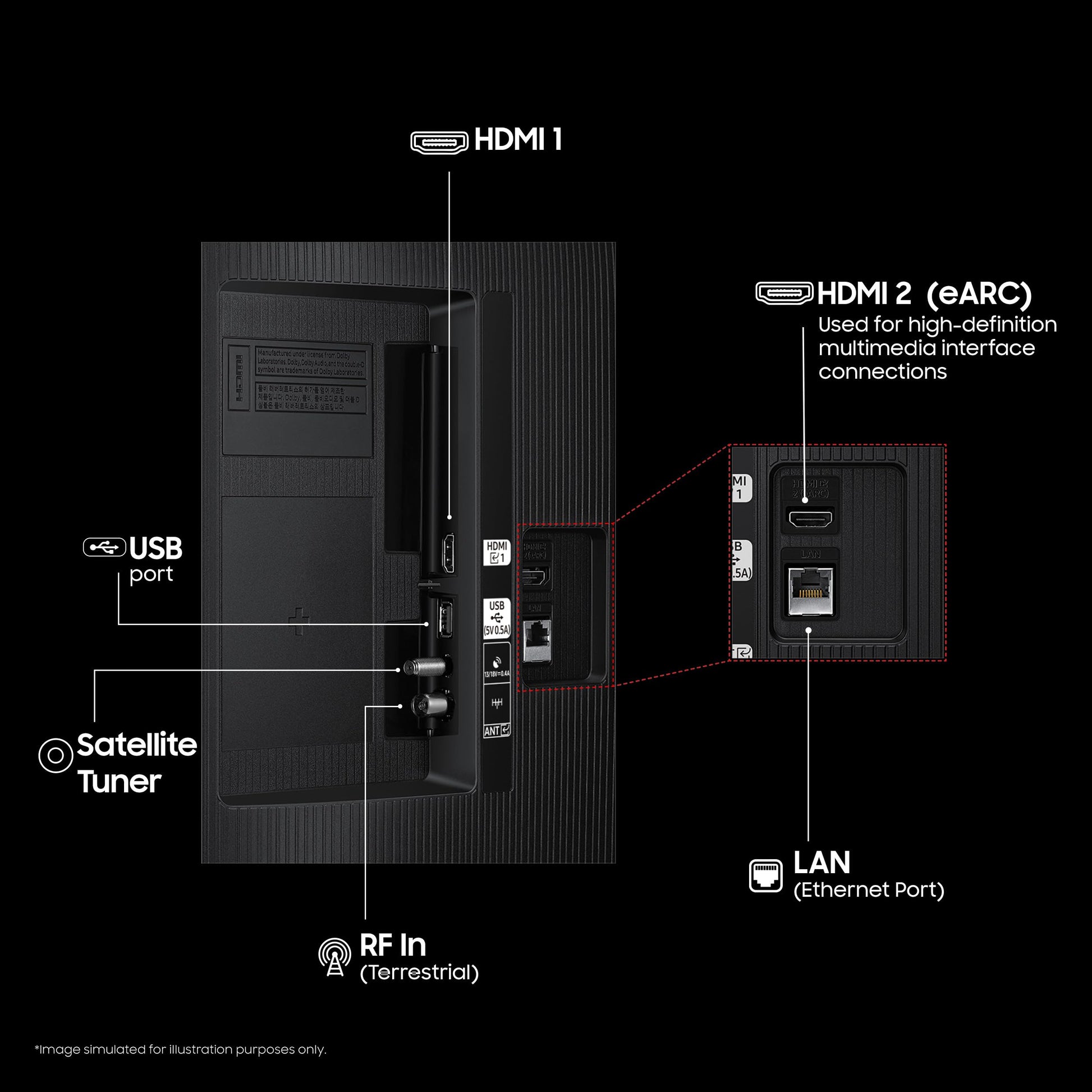 - Seamlessly connect your devices with multiple connectivity options: Wi-Fi 5 for smooth streaming, Bluetooth for wireless audio devices, 2 HDMI ports (including HDMI eARC) for Set-Top Box/DTH and high-quality soundbars, Anynet+ (HDMI-CEC) for unified control, USB-A for media playback and external devices, Ethernet (LAN) for stable internet, and RF In for cable or antenna input. Stay connected and entertained effortlessly!