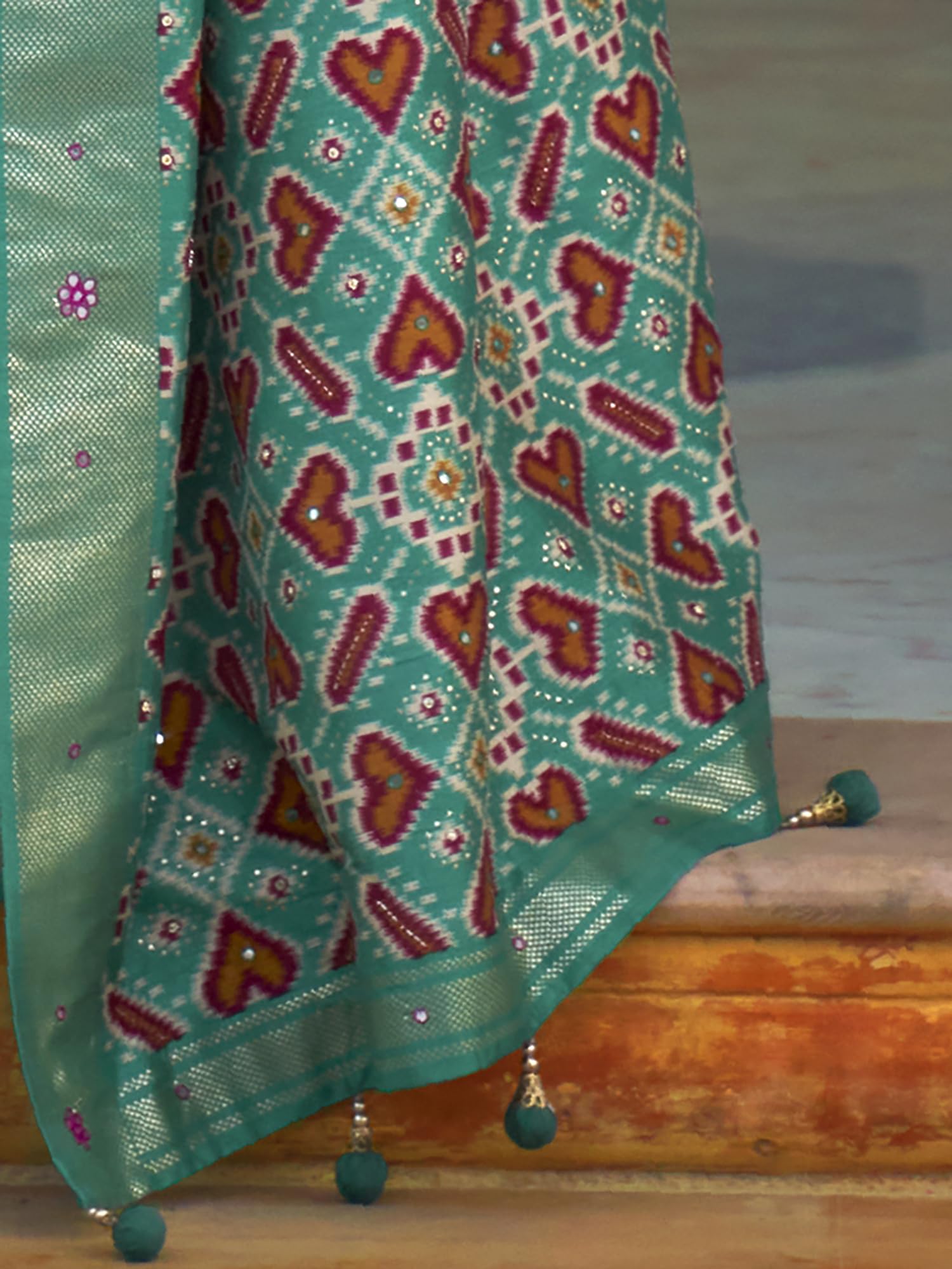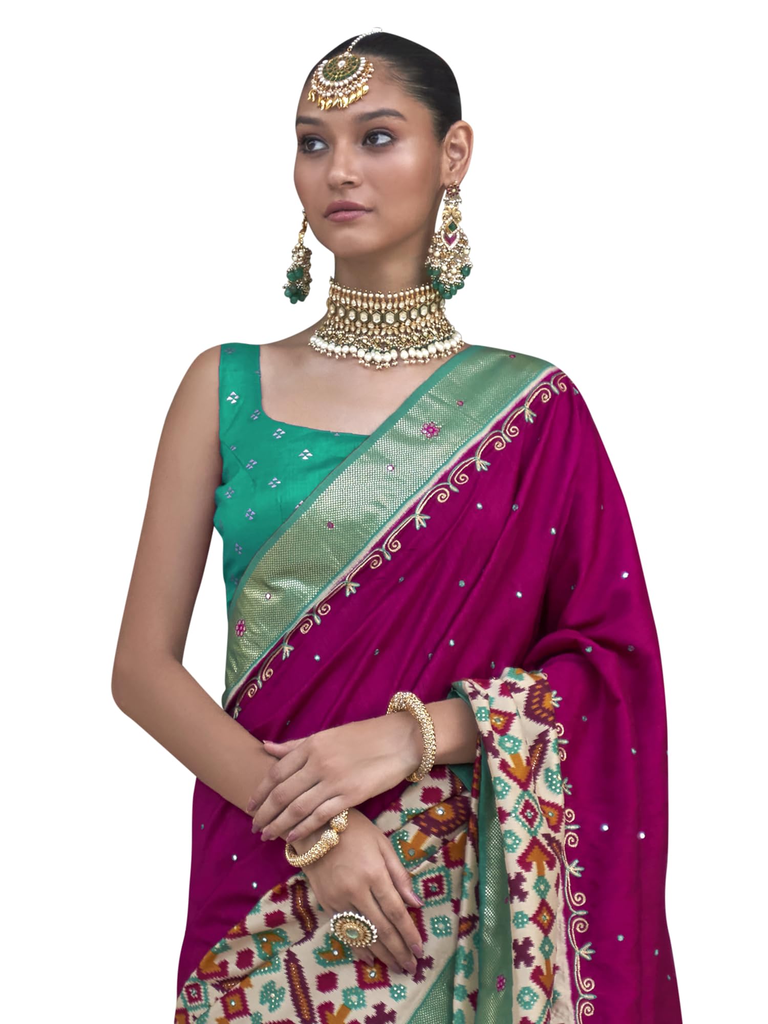 SAREE MALL Women's Ikat Printed Mirror Work Cotton Silk Saree With Unstiched Blouse Piece (Magenta_AARIP497_RW)