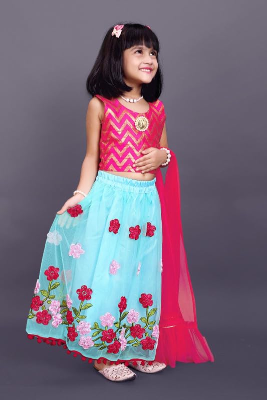 satyamfab Kids Net Fabric Thread Embroidered Work Lehenga With Jacquard Weaving Choli and Smooth Net Dupatta for Girls