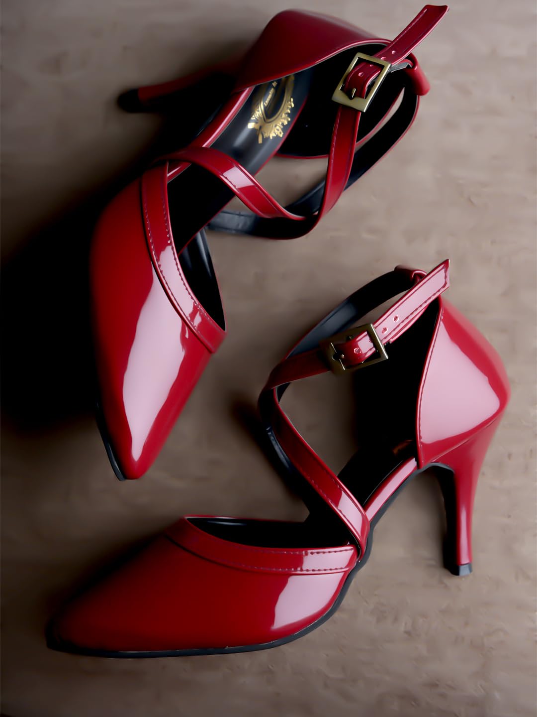 Shoetopia Women's Cherry Leather Heels Cross Strap Closed Toe Pumps with Buckle || Stylish High Heel Perfect for Office, Weddings, Cocktail Parties & Formal Events EU39