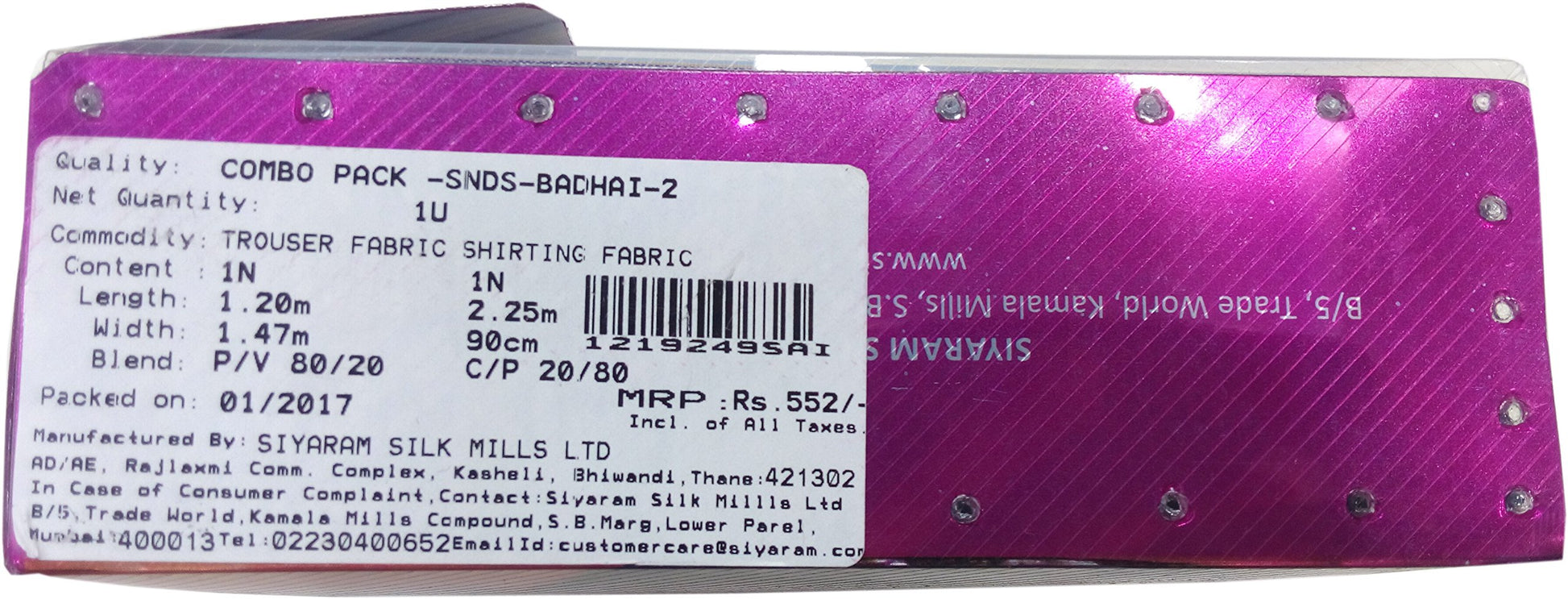 Features : Fresh Fabric: Pant Self or plain/ Shirt Check or Line, Pant/Shirt Blend: P/V 65/35, C/P 20/80, Net Quantity: Pant (1No.), Shirt (1No.), Length: 1.20 m. (Pant), 2.25 m. (Shirt), Width: 1.47 m, 90 cm, Colour Family: Multi Design. Lifestyle Casual/Gift Purpose Wash Care Hand Wash Each combo pack consists of different colour and design from the picture of combo.