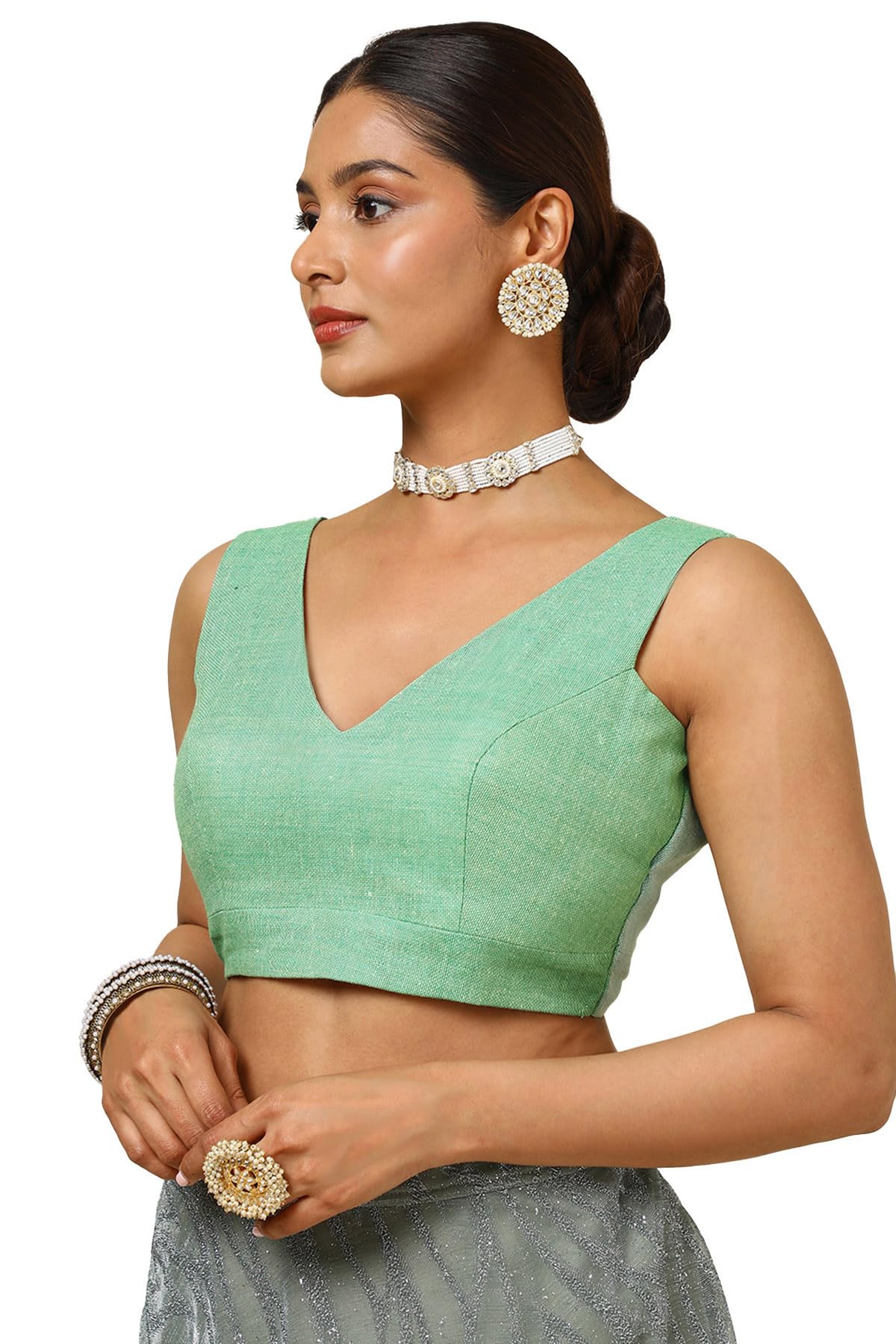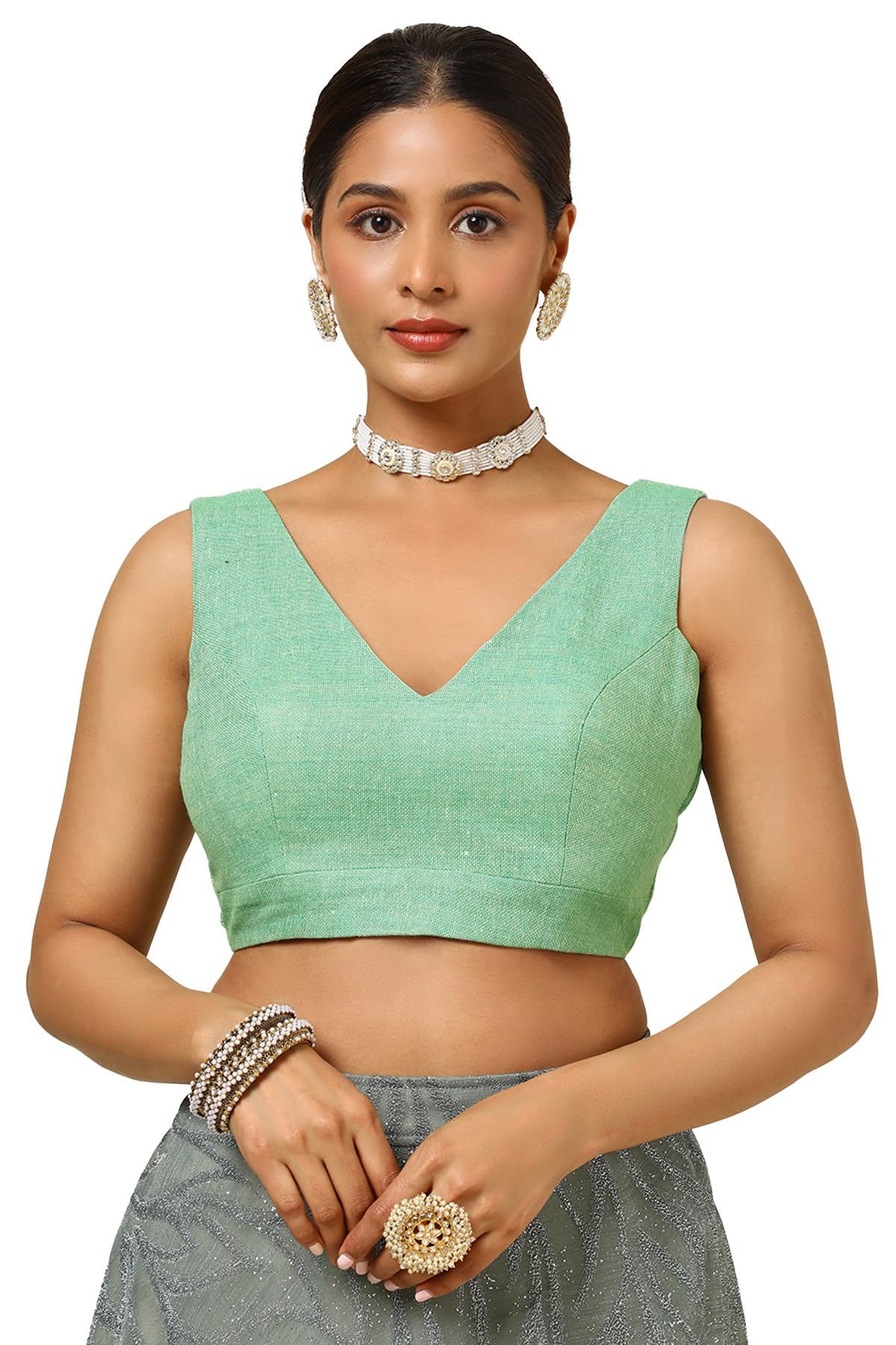 Explore fresh fancies with our charcoal jute padded blouse and secured with hook & eye back closure. This blouse can be paired with a cotton saree for a comfortable look. The blouse has a v-neck with sleeveless with add-on unstitched sleeves. The new blouse design features padding to enhance comfort and structure.