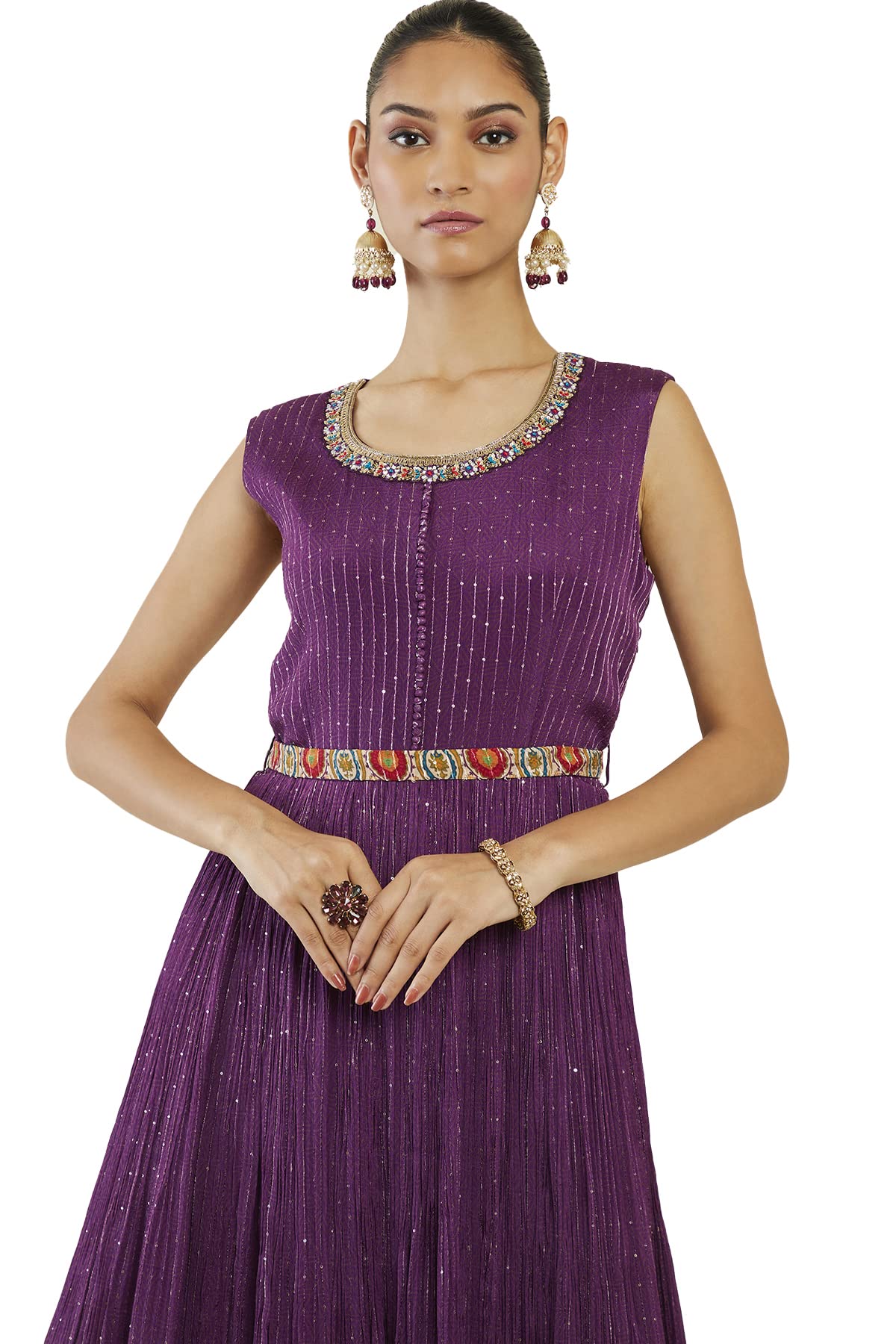 - The Gown of this Purple Georgette has a Round Neck with No Sleeves
