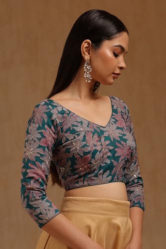 Soch Womens Blue Organza Floral Print Padded Blouse with Zari