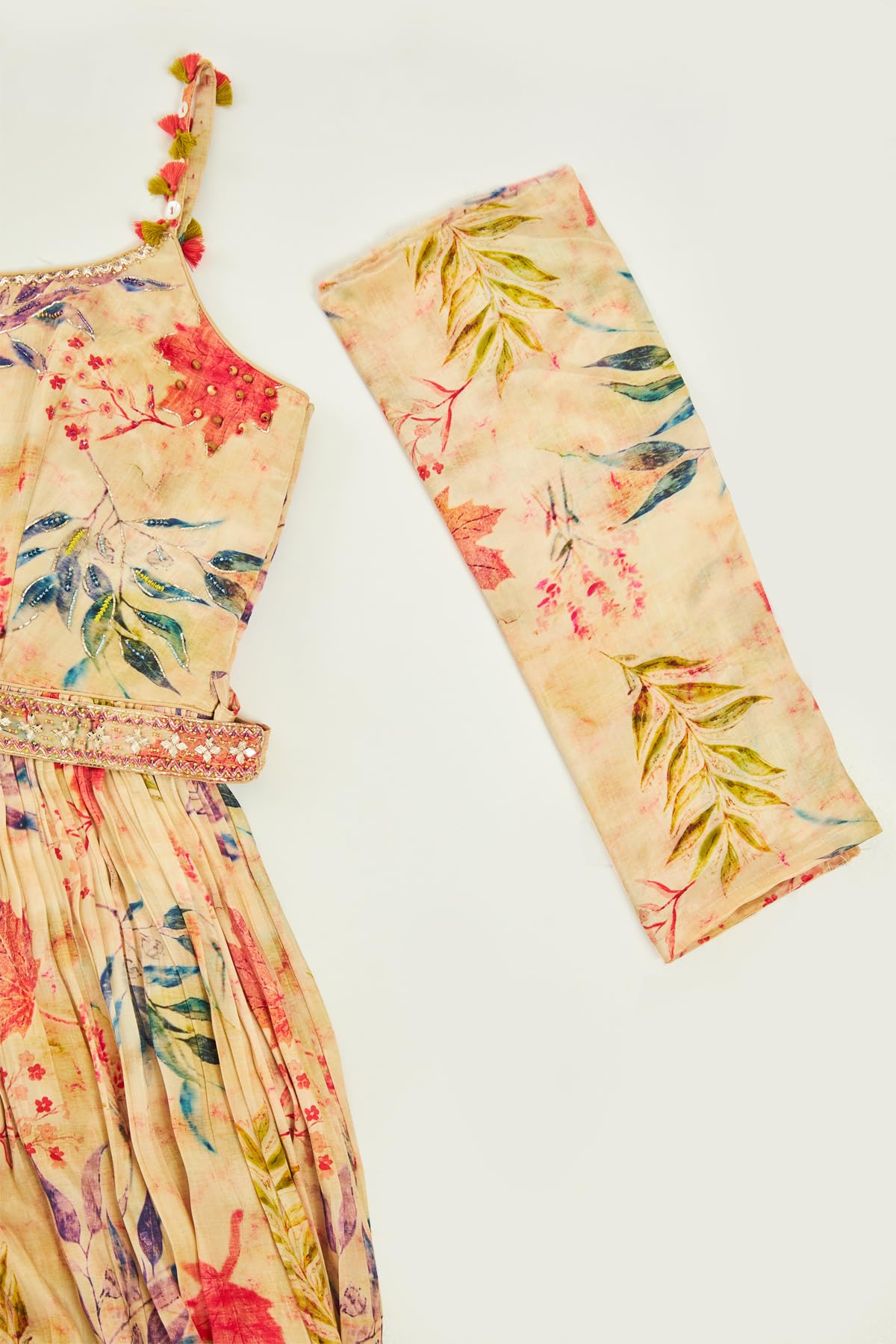 Enhance your evening attire with our beige crepe fit & flare gown with dupatta. This women's ethnic gown has a flounce hem, halter neckline, intact floral print, and delicate mirror work. It also has a zip fastening. It also has an ornamented belt with a tie-up fastening and an add-on with unstitched sleeves. It is worn with a sheer net dupatta.This dress is ideal for elegant events, weddings, or other special occasions that will make you stand out from the crowd.