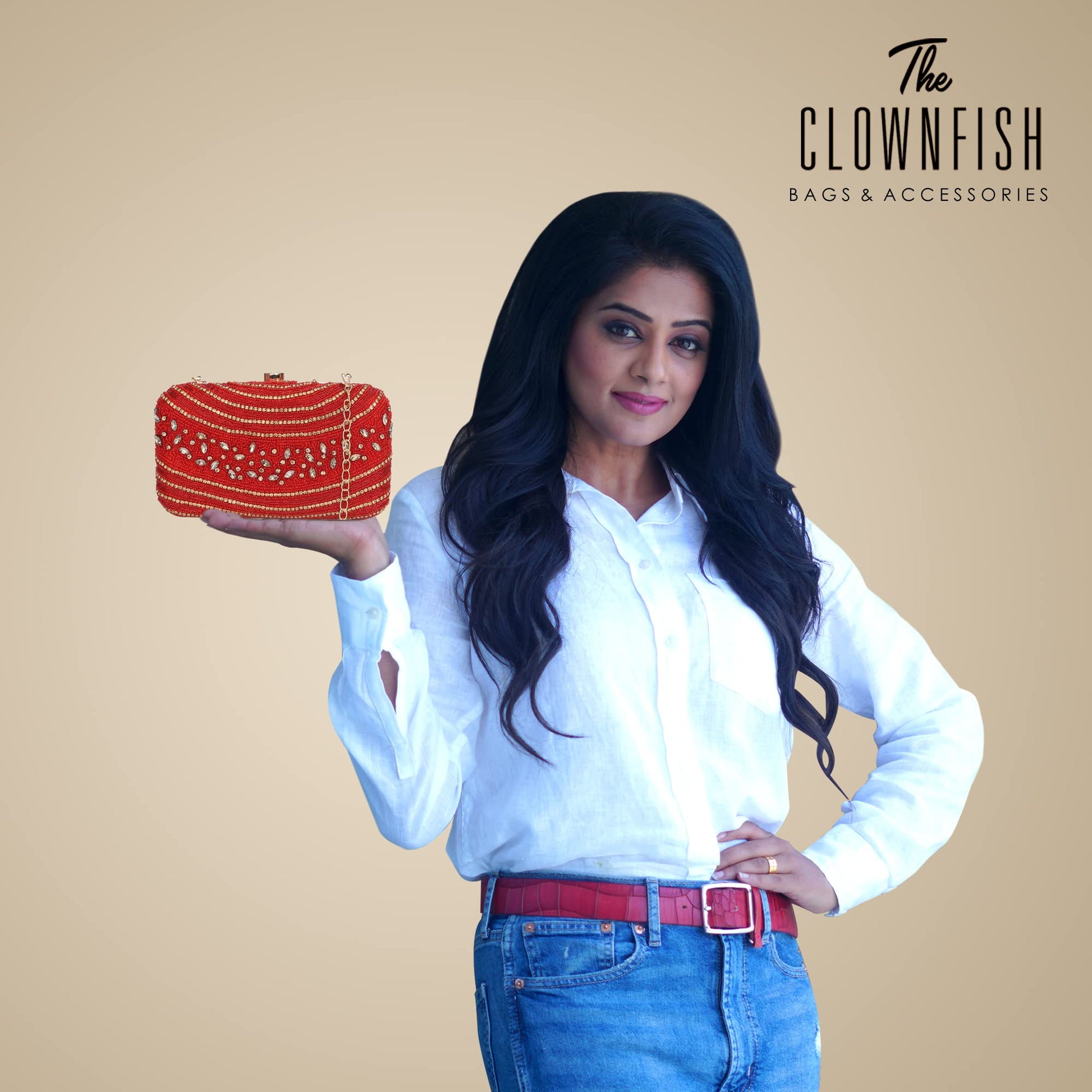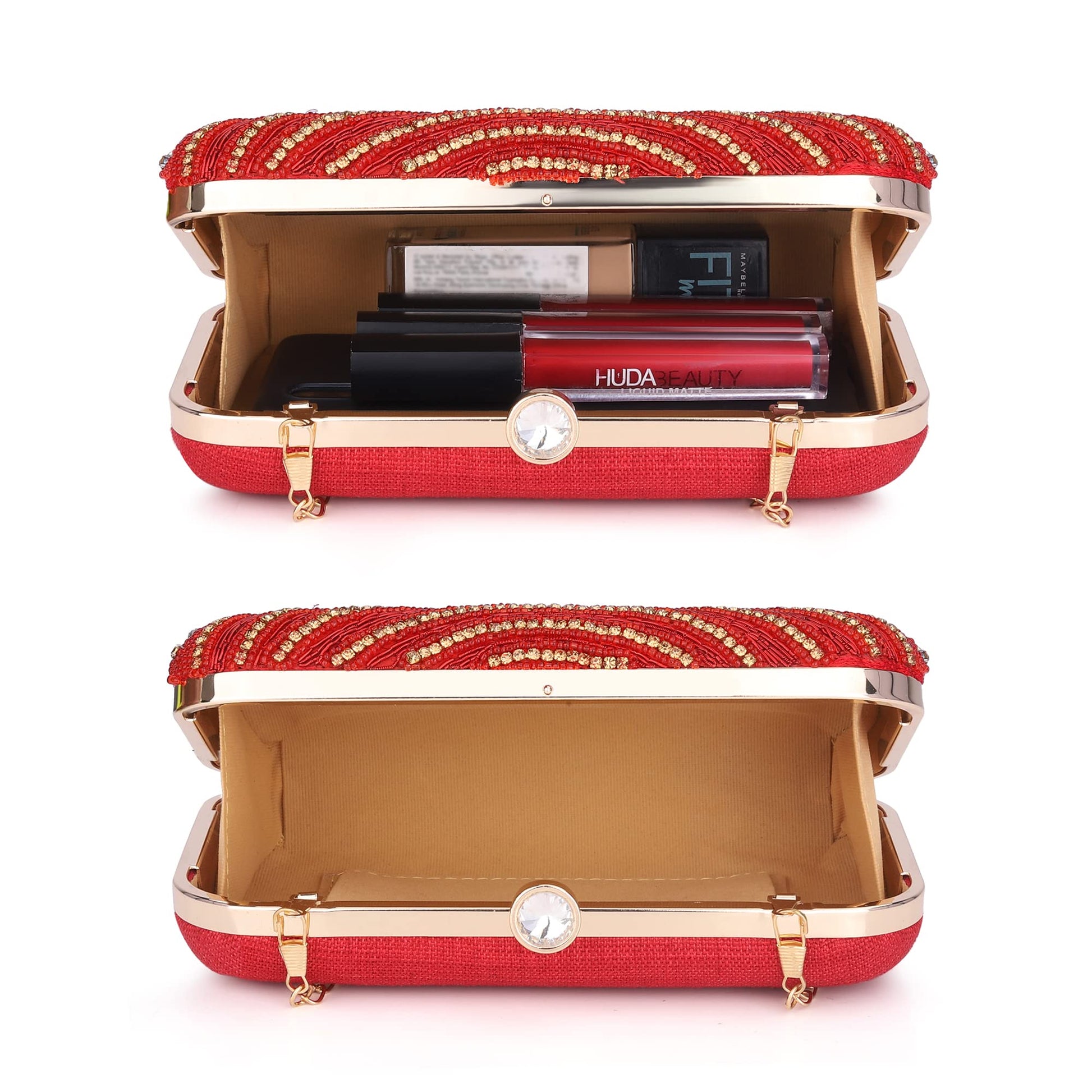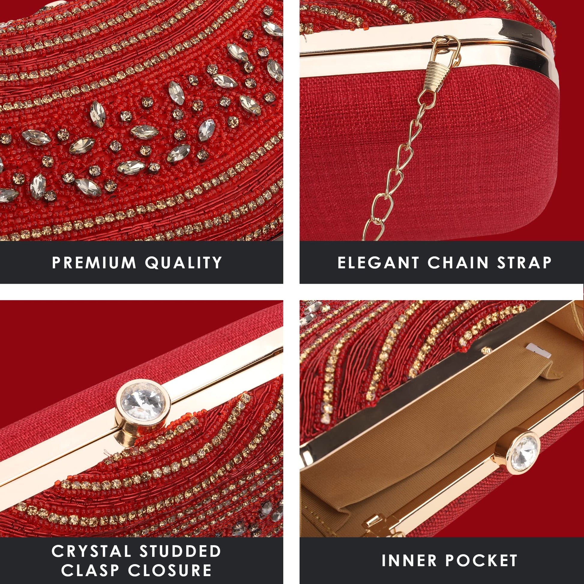 The Clownfish Emerald Collection Womens Party Clutch Ladies Wallet Evening Bag with Fashionable Round Corners Beads Work Floral Design (Red)