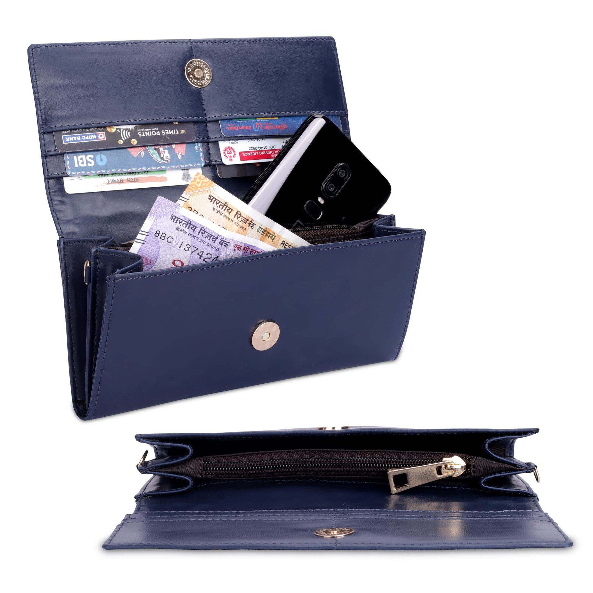 - CONVENIENT DESIGN: This wallet has been provided with main compartment with a snap flap closure that opens to reveal two main pockets spaced with a zip pocket in the middle to hold your cash, coins, bills etc. Multiple card slots for placing your credit and debit cards. Back zip pocket for mobile or added utility. Comes with a shoulder belt that gives an elegant look to the wallet and can be used as a sling bag too.