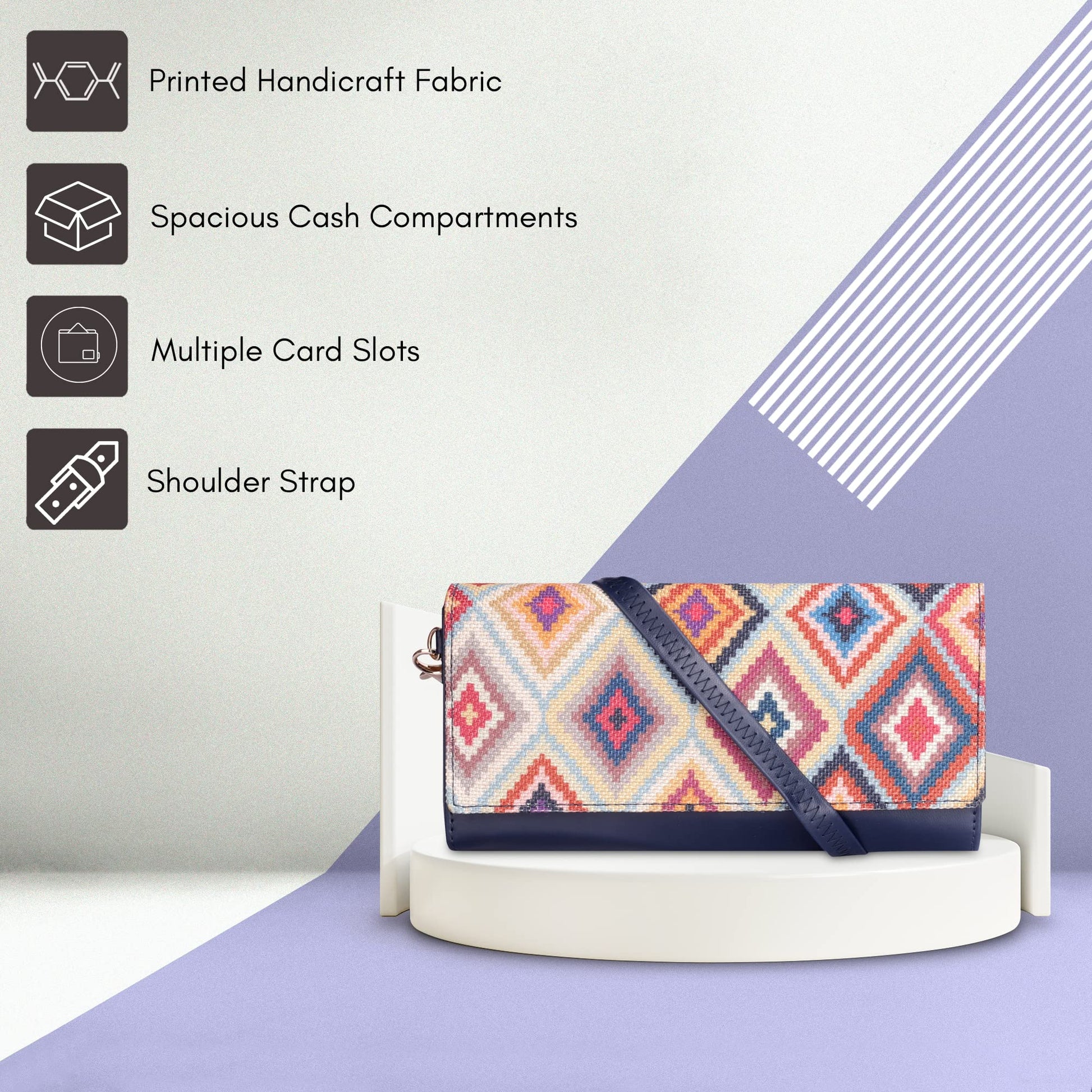 THE CLOWNFISH Women Jolene Printed Handicraft Fabric & Vegan Leather Ladies Wristlet Purse Sling Bag With Multiple Card Slots (Multicolour-Diamond Design), Multicolor