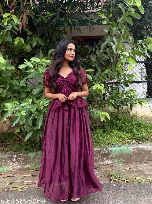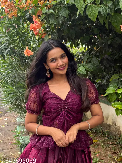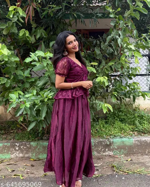 Make a stunning style statement with this elegant Wine Color Peplum Top & Skirt Set, designed for parties, festive outings, and special functions.
