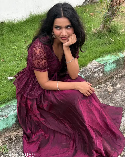 NameTHE KAVYAHI FASHION Women's Wine Color Embroidered Peplum Top & Flared Skirt Set | Partywear Crop Top & Maxi Skirt