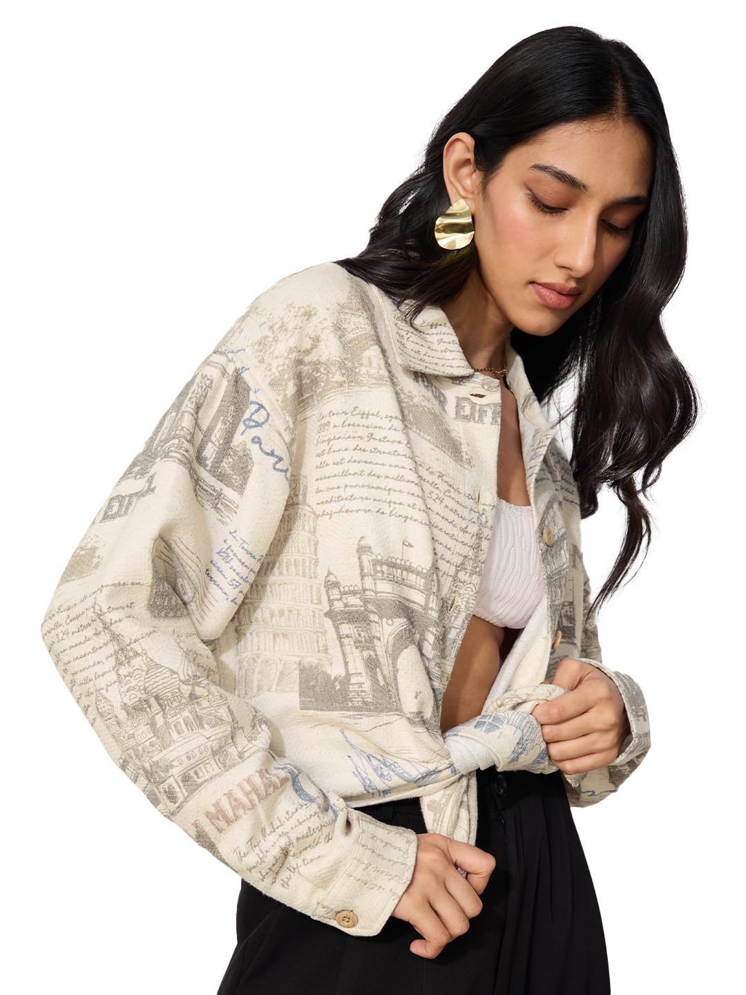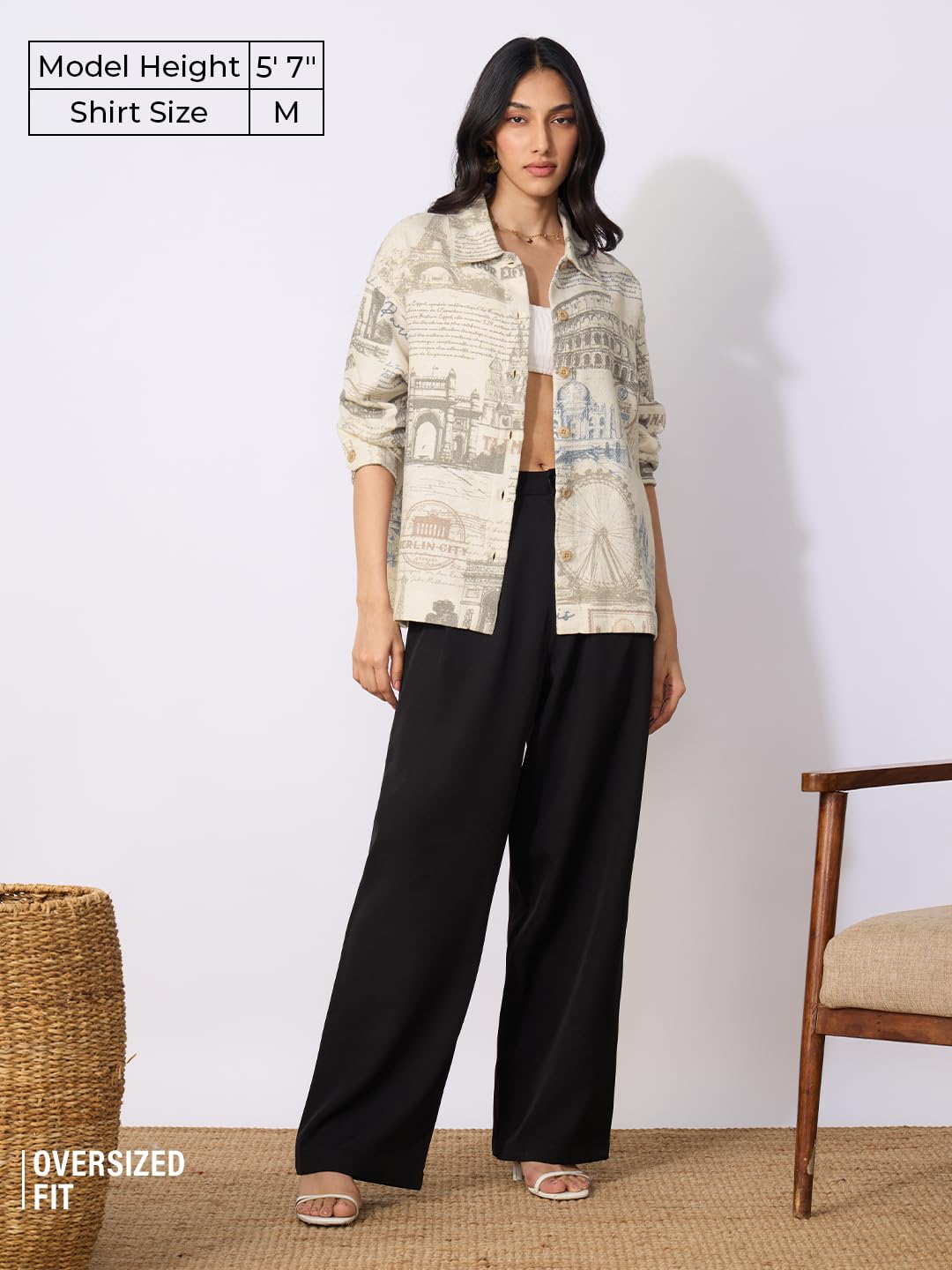 The Souled Store Monuments Women and Girls Long Sleeves Collared Neck Button Front Biege All Over Printed Cotton Boyfriend Shirts