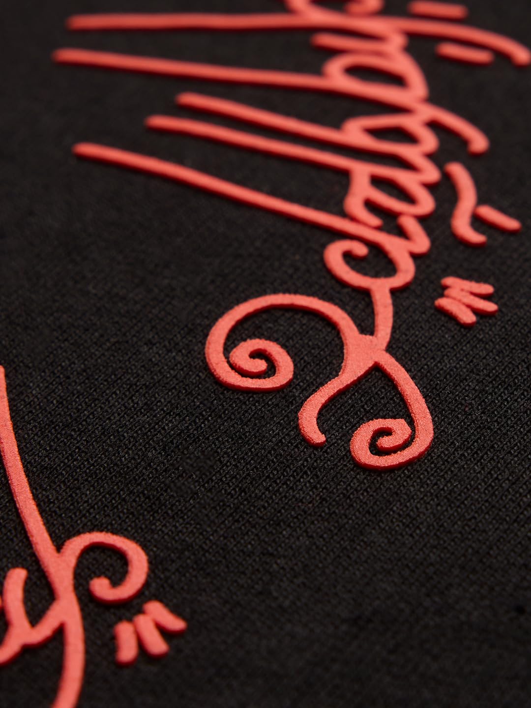 - Black cotton fabric with bold graphic print,Short sleeve round neck style for casual comfort.
