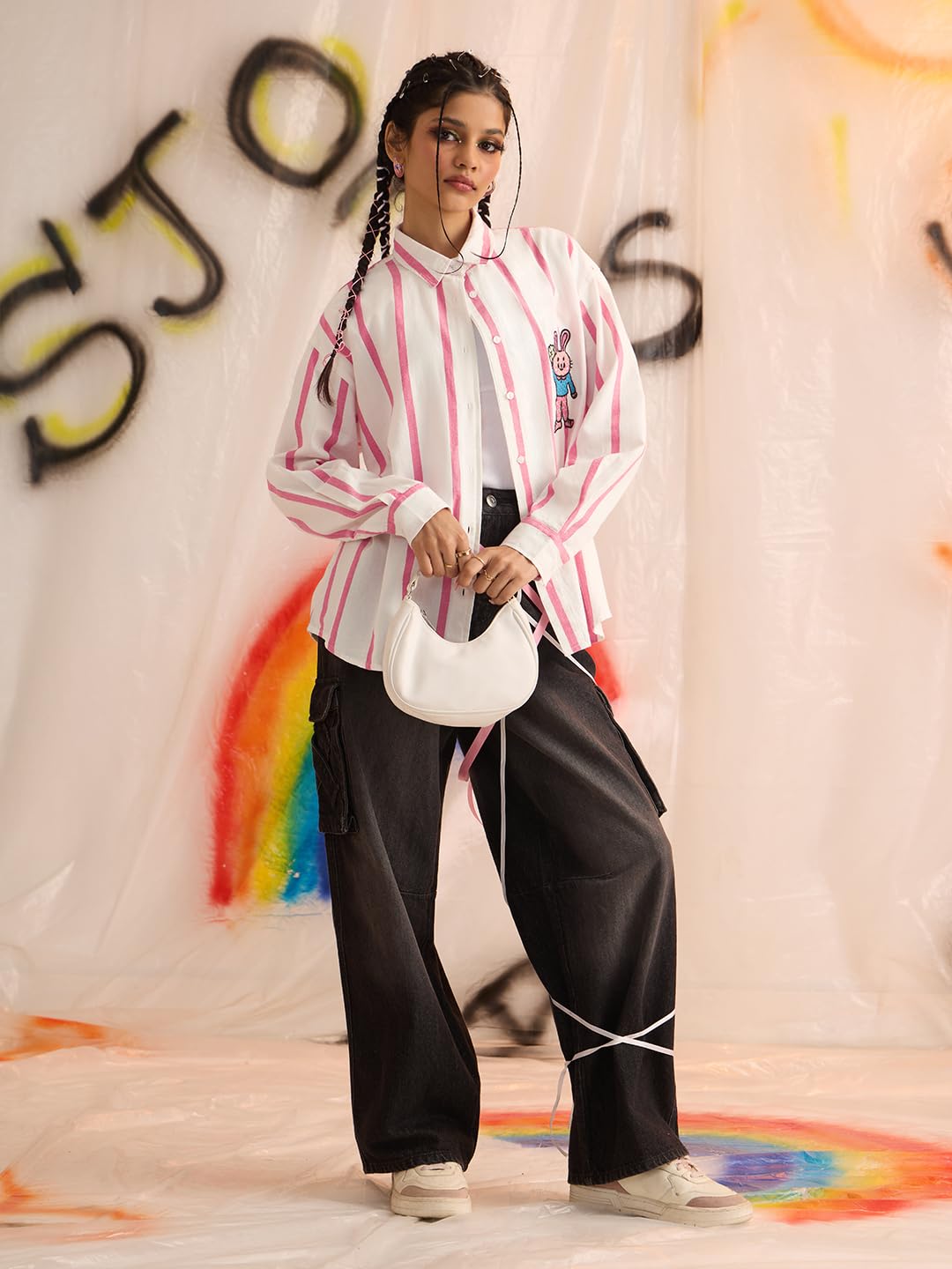 The Souled Store Pink Stripes: Clover Bunny Women and Girls Long Sleeves Spread Collar Button Front Striped Embroidered Cotton Oversized Fit Lightweight Comfortable All-Season Boyfriend Shirt