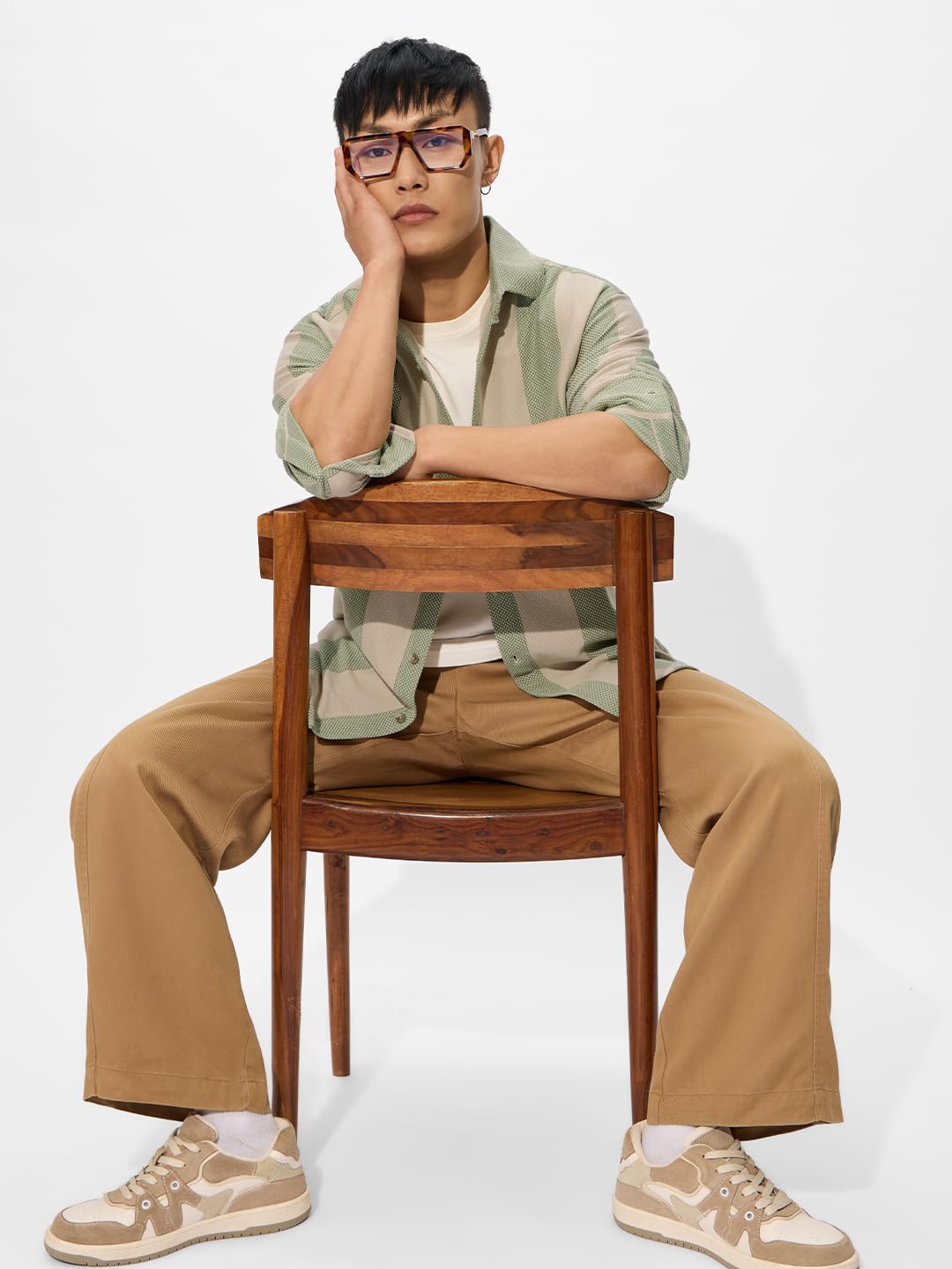 The Souled Store Stripes: Sage Men and Boys Short Sleeves Collared Neck Button Front Regular Fit Cotton Shirt
