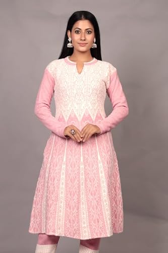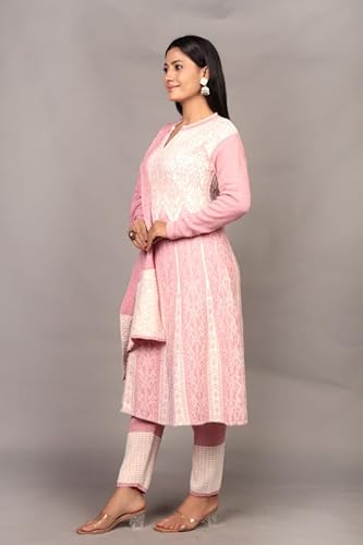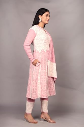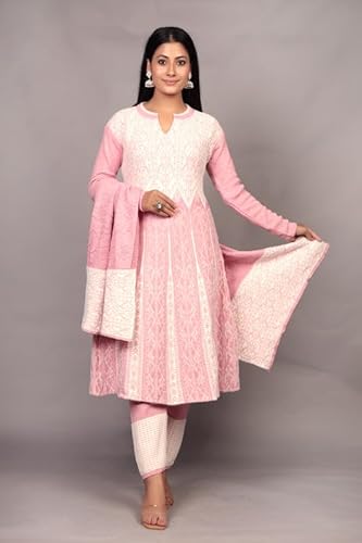 The Zigar Studio Woolen Kurta Set With Pants and Dupatta - Stitched Embroidery Suit Set with Pants and Dupatta-Floral Embroidery Woolen Kurta Set for Women Pk-Fullhair-Pink-L