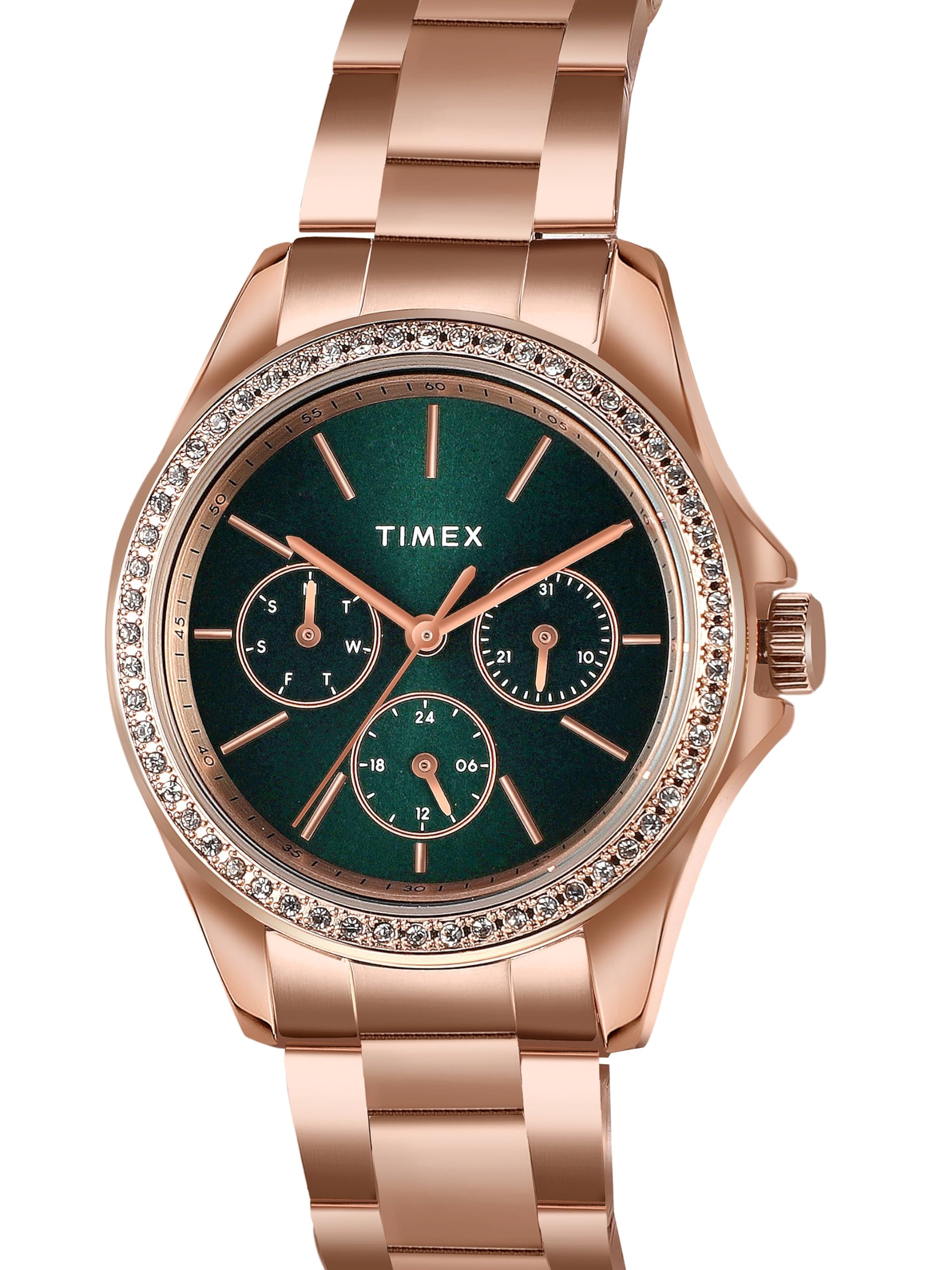 TIMEX Analog Watch for Women with Green Round Dial & Rose Gold Stainless Steel Bracelet Band Water Resistant Women's Wrist Watches - TW000Z402