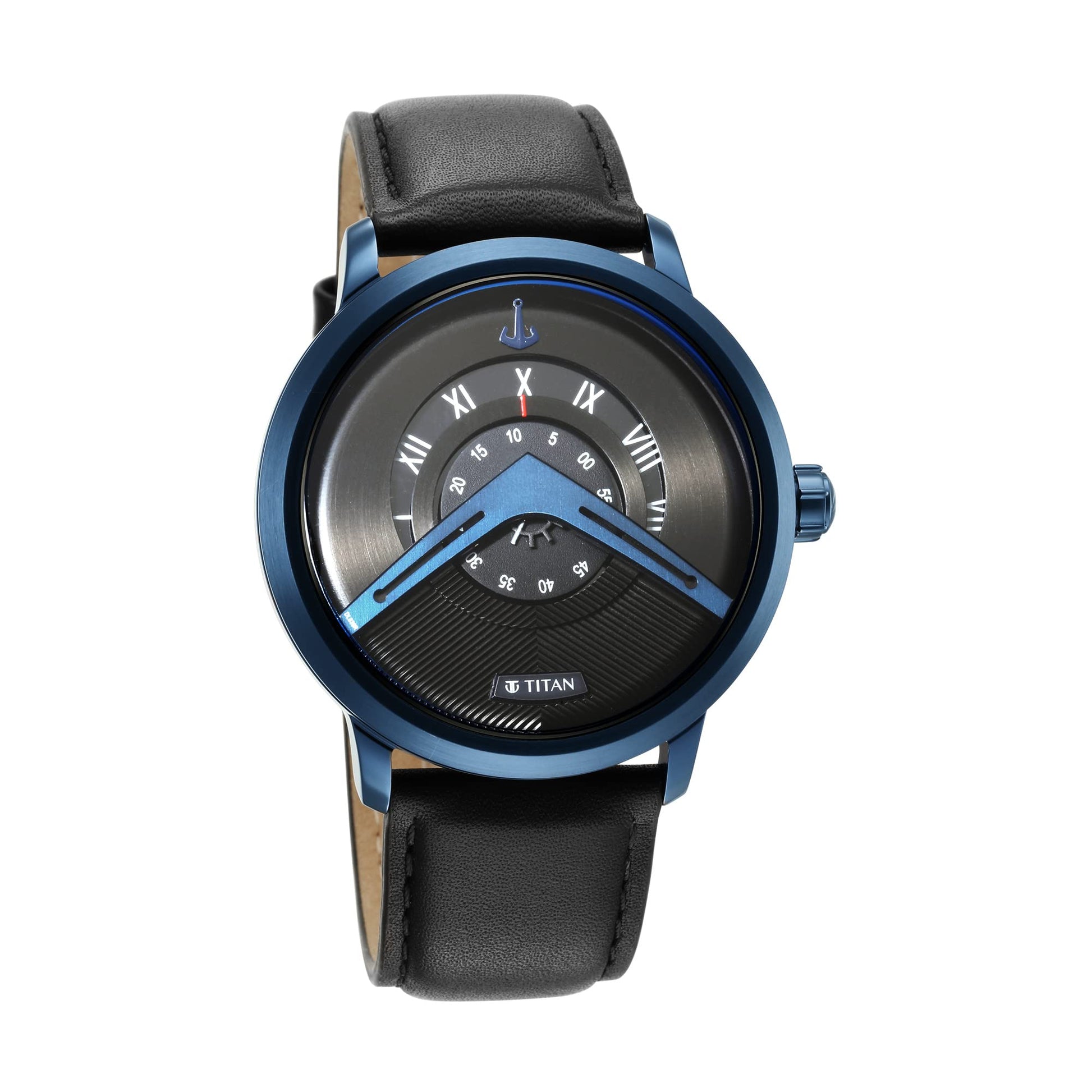 Inspired by maritime elegance, this Titan Maritime watch is a daring expression of nautical charm and contemporary design. The striking black dial features a unique ship-wheel-inspired retrograde display encased in a bold blue stainless steel case. With Its arched bridge-style time indicators, Roman numeral layout, and smooth black leather strap, this timepiece is built for the modern explorer who navigates both style and substance effortlessly.