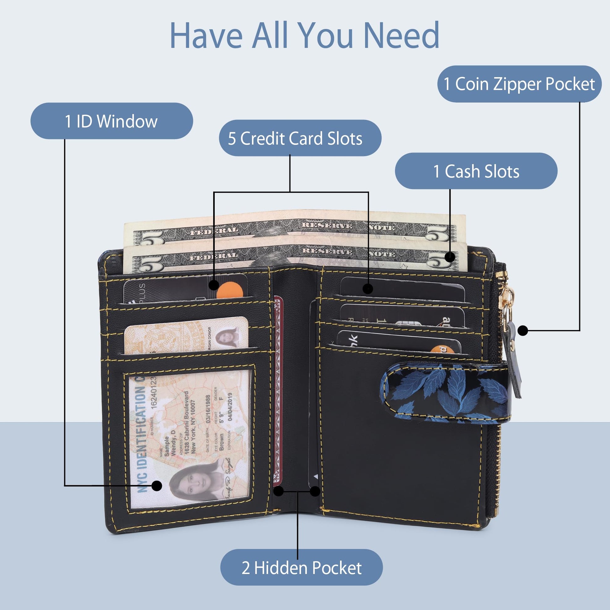 - 5 in build Credit card slots 2 Secret Compartment 1 Coin pocket 1 Currency compartment