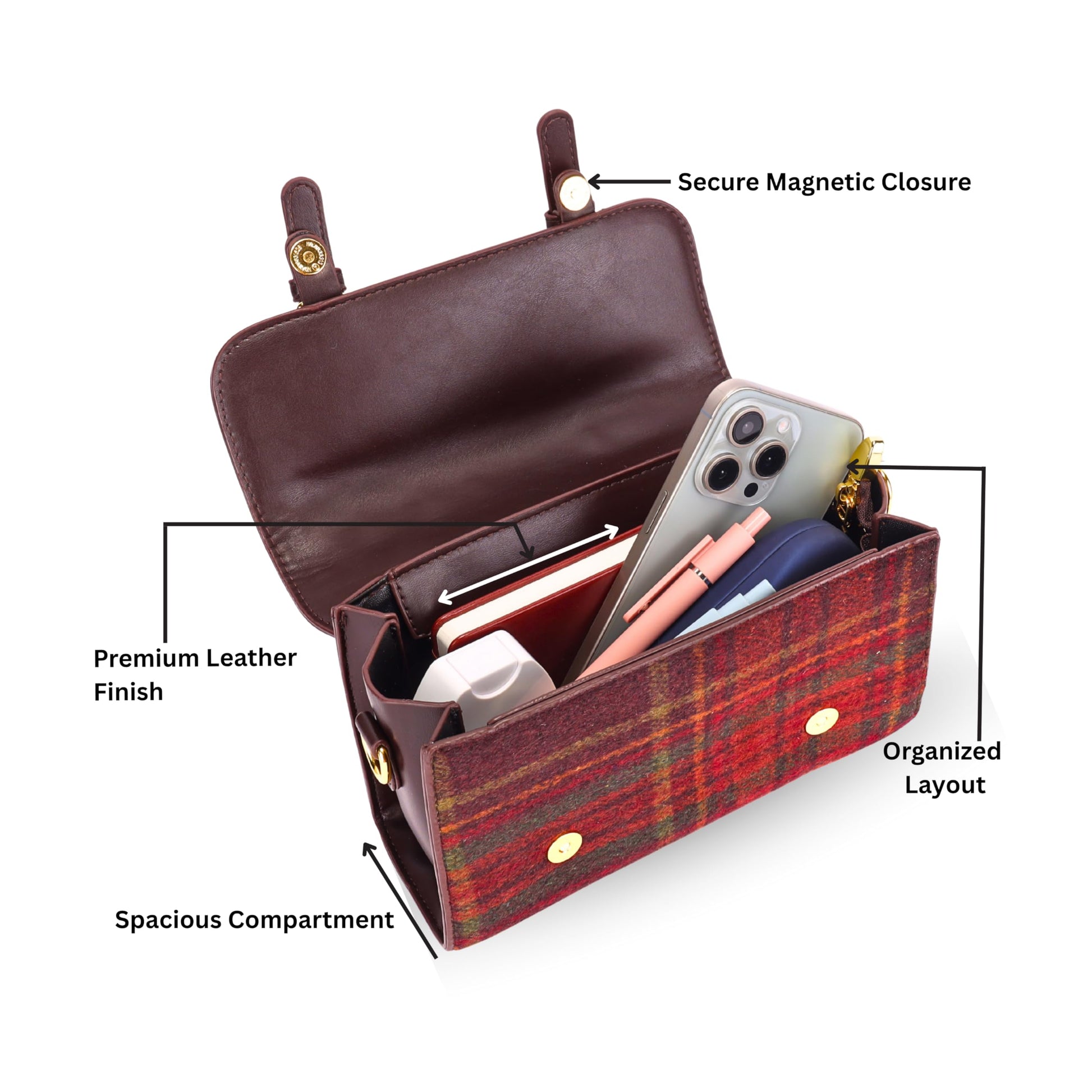 - 4️⃣ Compact Yet Functional Luxury Size Thoughtfully structured to hold essentials like phone, wallet, cards, keys and makeup while remaining lightweight, stylish and easy to carry all day.