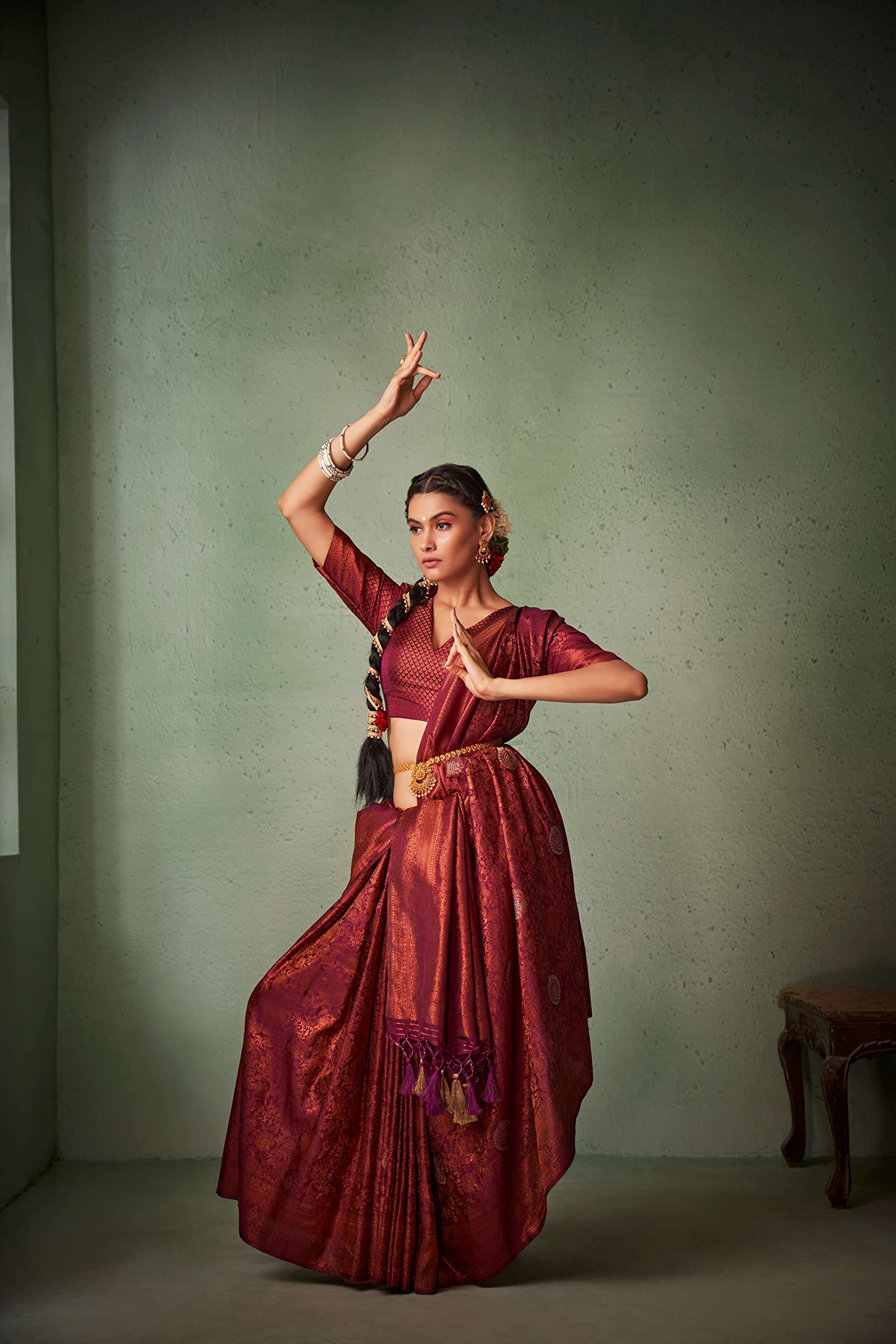 • PREMIUM QUALITY: This Woven Copper Zari Design Saree is made from premium quality Art silk material. It comes with an unstitched Brocade Blouse with Copper Zari Border